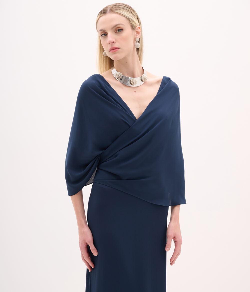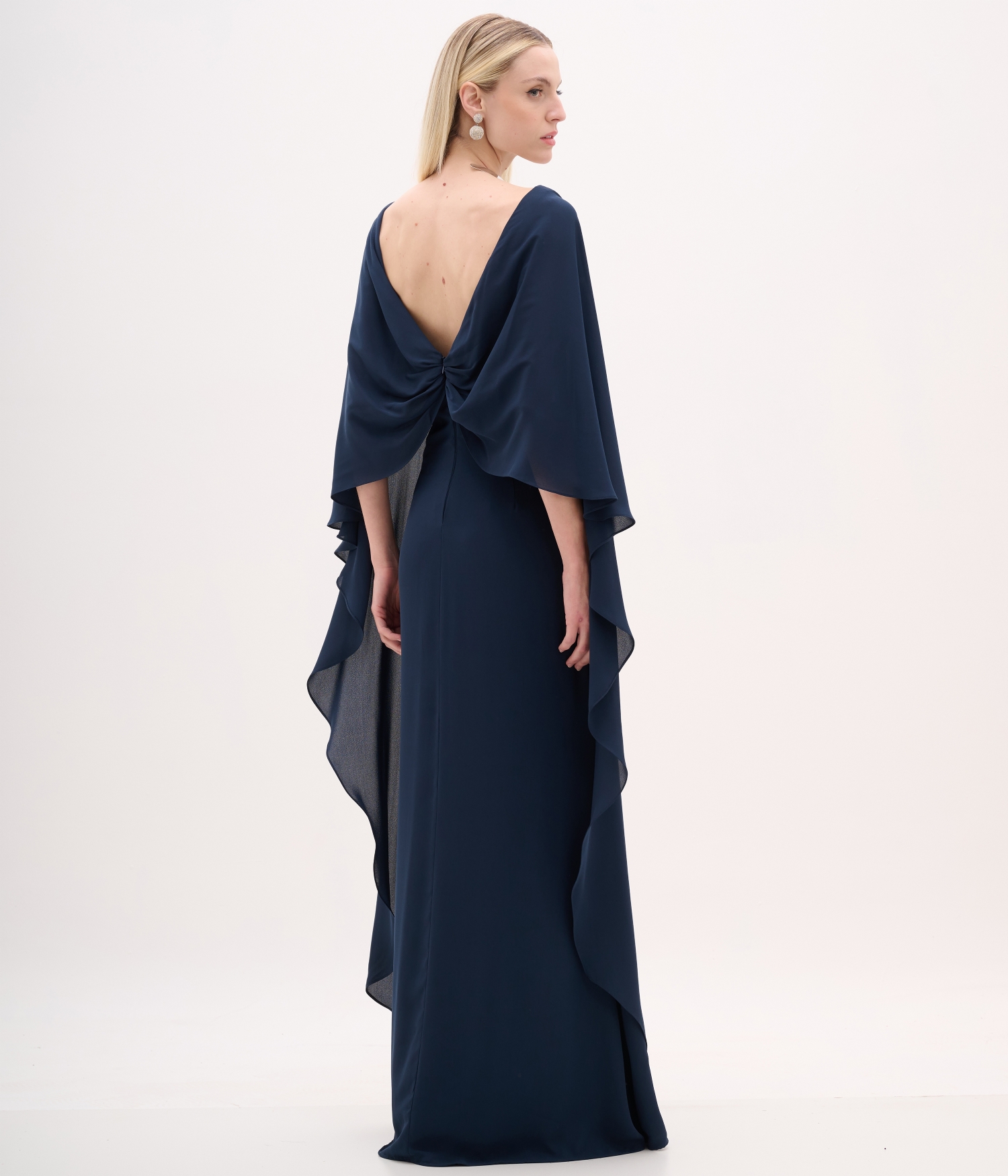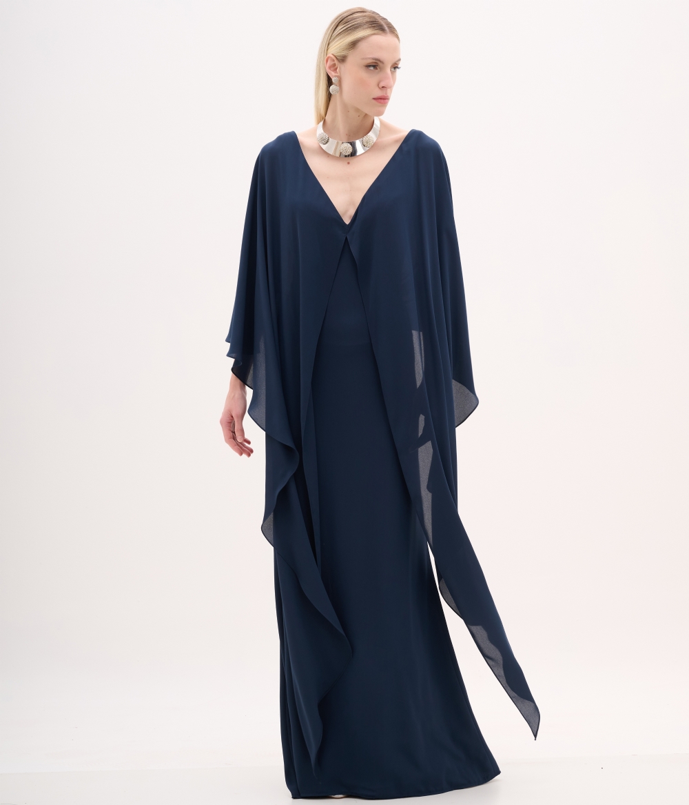 Vestido longo confeccionado em transparencia optical. A peça tem modelagem ampla, o charme do recorte vazado nas mangas deixa a peça exclusiva e elegante.