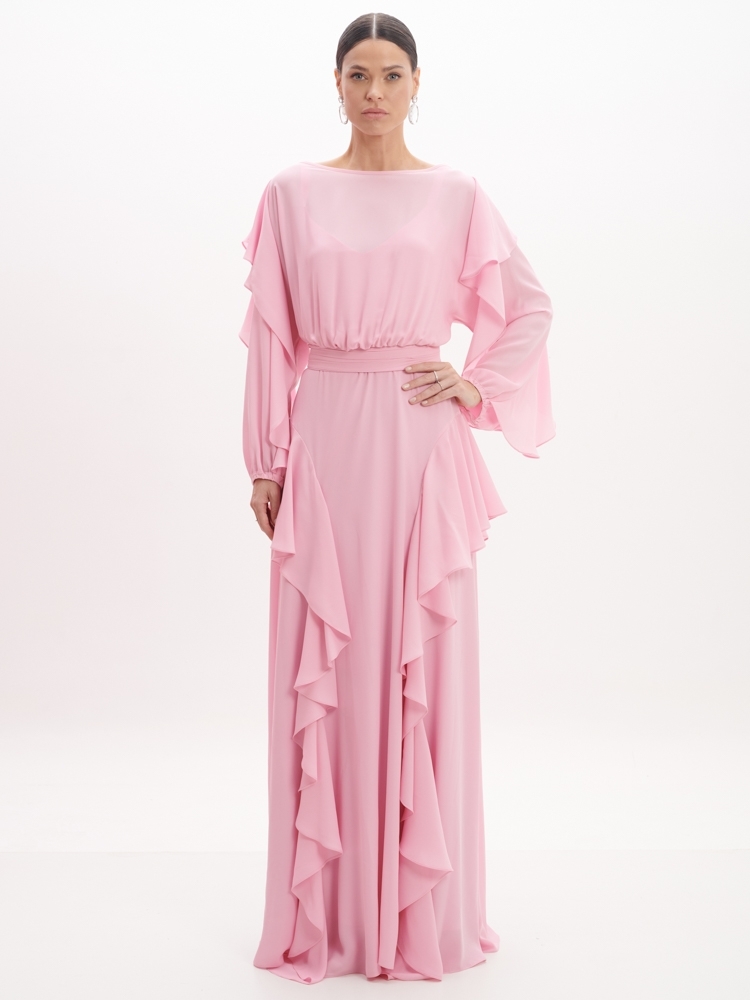 O vestido de festa longo rosa é confeccionado em crepe leve e fluido, com acabamento sofisticado que transmite feminilidade e elegância. O modelo apresenta mangas longas com leve volume, decote fechado e cintura marcada, garantindo equilíbrio entre romantismo e sofisticação. O grande destaque fica por conta dos babados assimétricos que caem ao longo da saia e das mangas, proporcionando movimento e charme extra à produção.