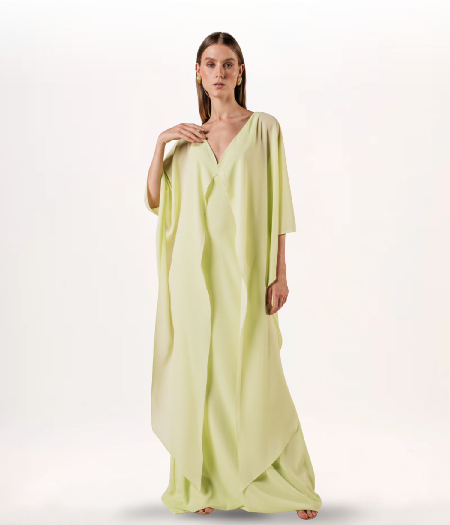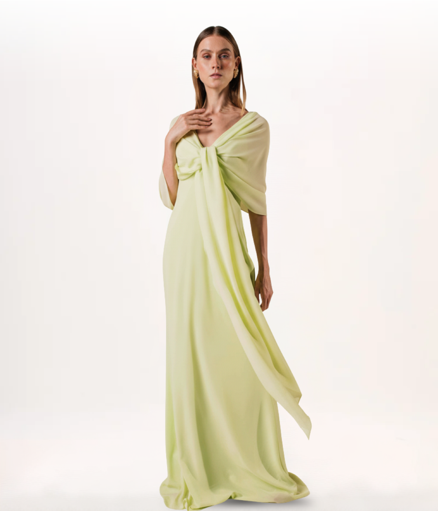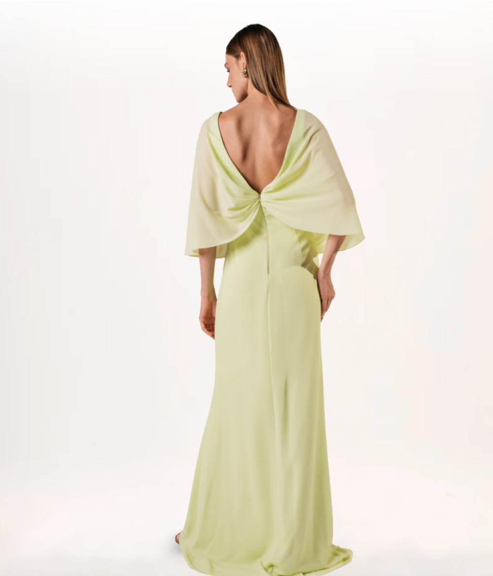 Vestido de festa longo reto com decote em V e pontas que permitem uma grande versatilidade pro modelo. Confeccionado em crepe fluido.