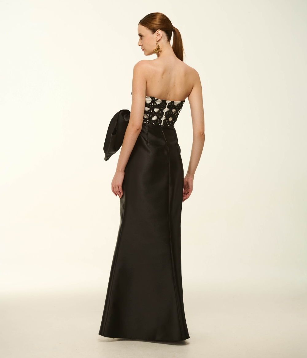 Vestido Longo Bicolor em Zibeline com Detalhe em Cestaria e Modelagem Estruturada