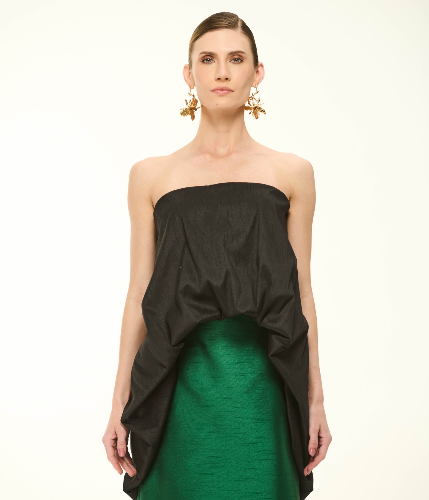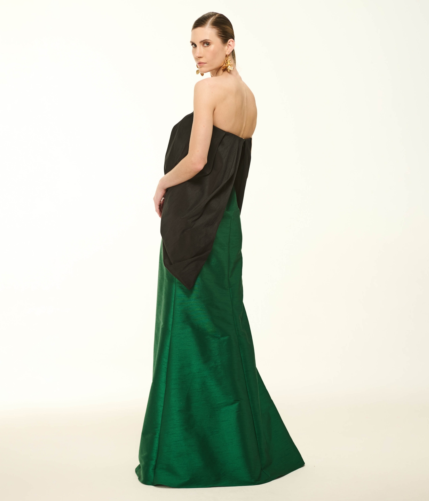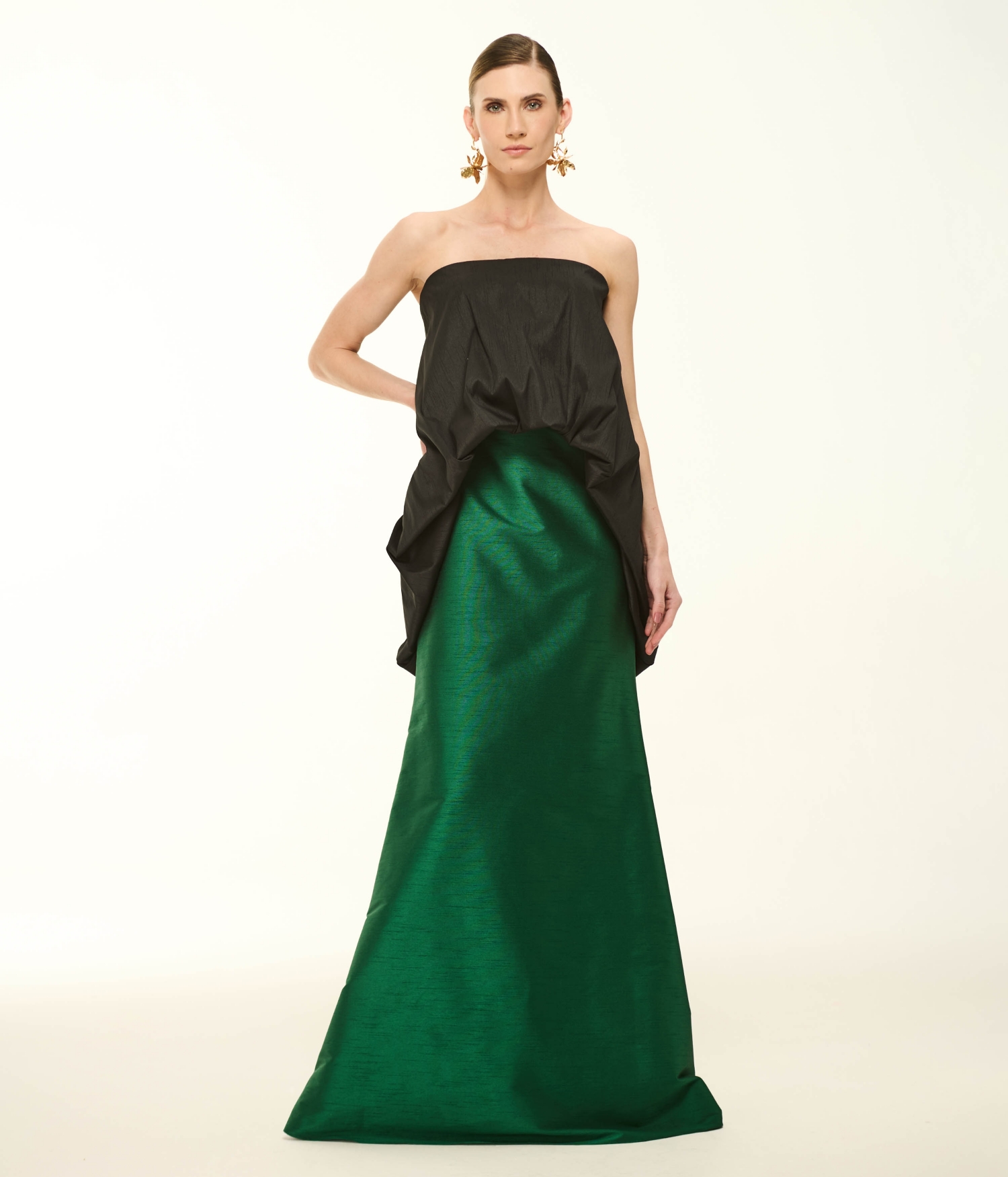 O Vestido VL288 é uma obra-prima de contrastes e volumes arquitetônicos, pensado para a mulher que deseja um impacto visual inesquecível. Confeccionado em shantung, um tecido nobre reconhecido por sua textura singular e caimento estruturado, o modelo destaca-se por sua estética bicolor de alta moda. A parte superior apresenta um decote tomara que caia profundo na cor preta, com um finíssimo trabalho de drapeados manuais que emolduram o busto de forma escultural e romântica. A partir da linha da cintura, a peça se desdobra em uma magnífica saia evasê longa e volumosa em tom verde vibrante. O fechamento é realizado por um zíper posterior invisível, garantindo um acabamento perfeito e contínuo. É a escolha definitiva para protagonizar eventos de gala com uma postura majestosa e contemporânea.