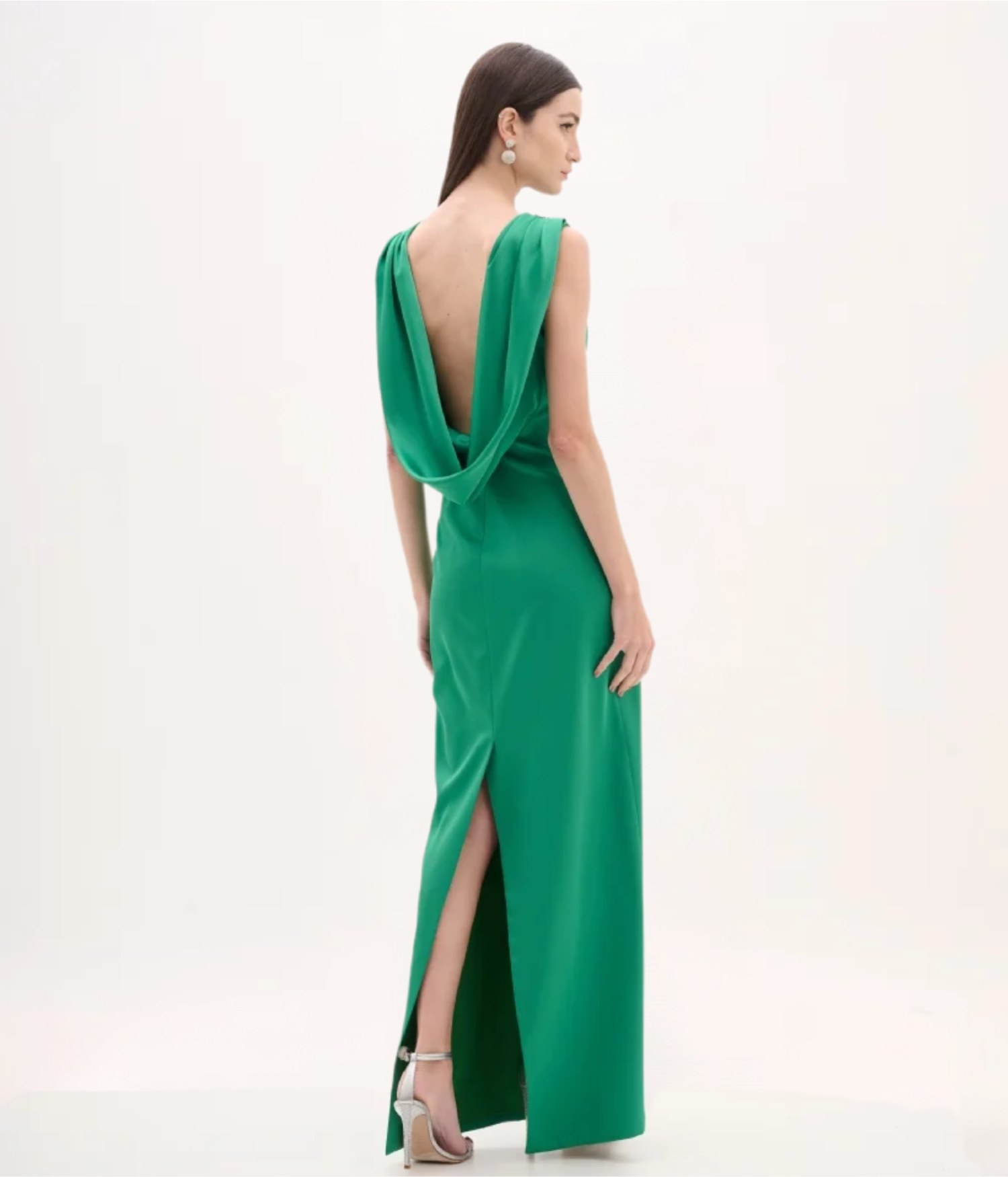 Vestido Longo em Cetim Encorpado Verde com Decote Degagê nas Costas