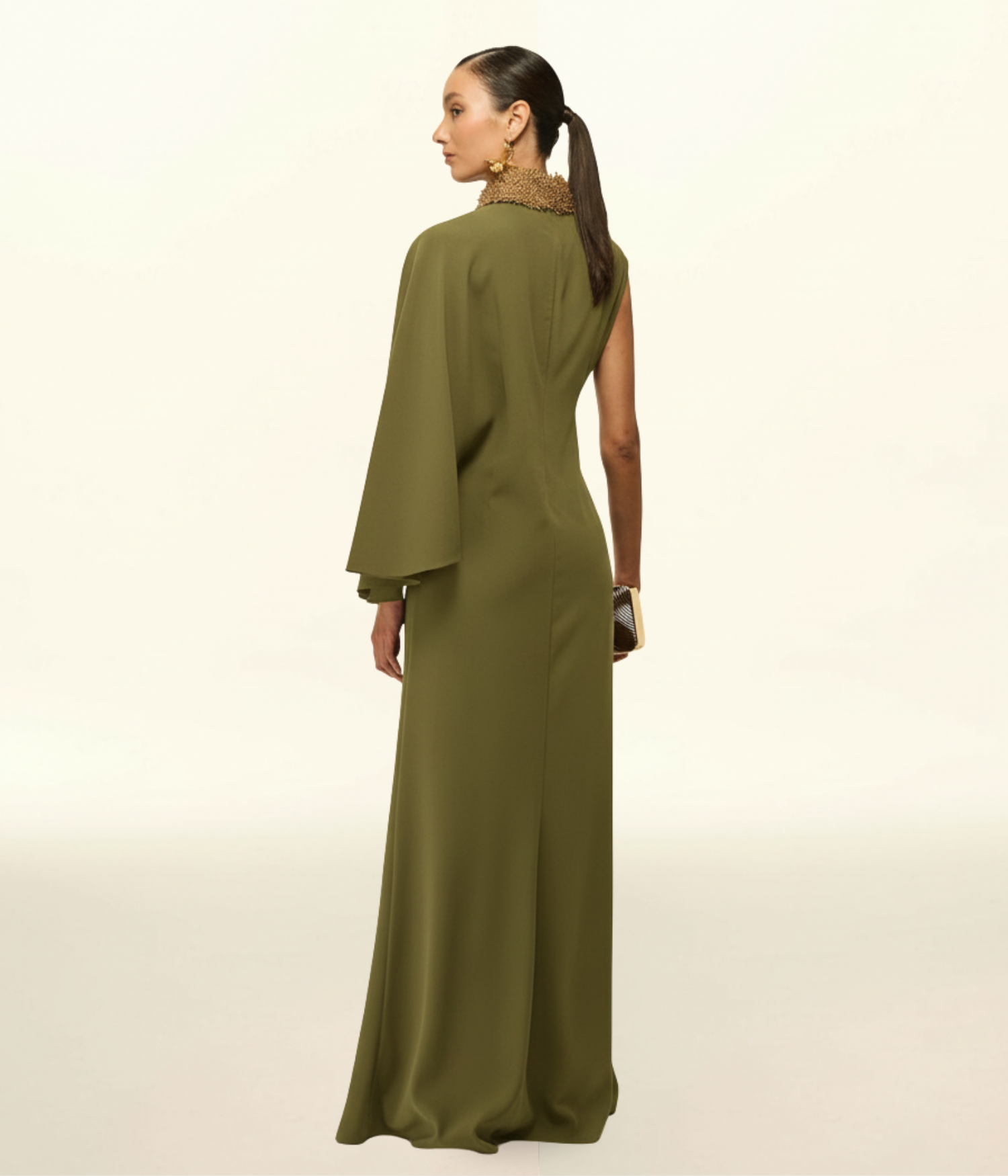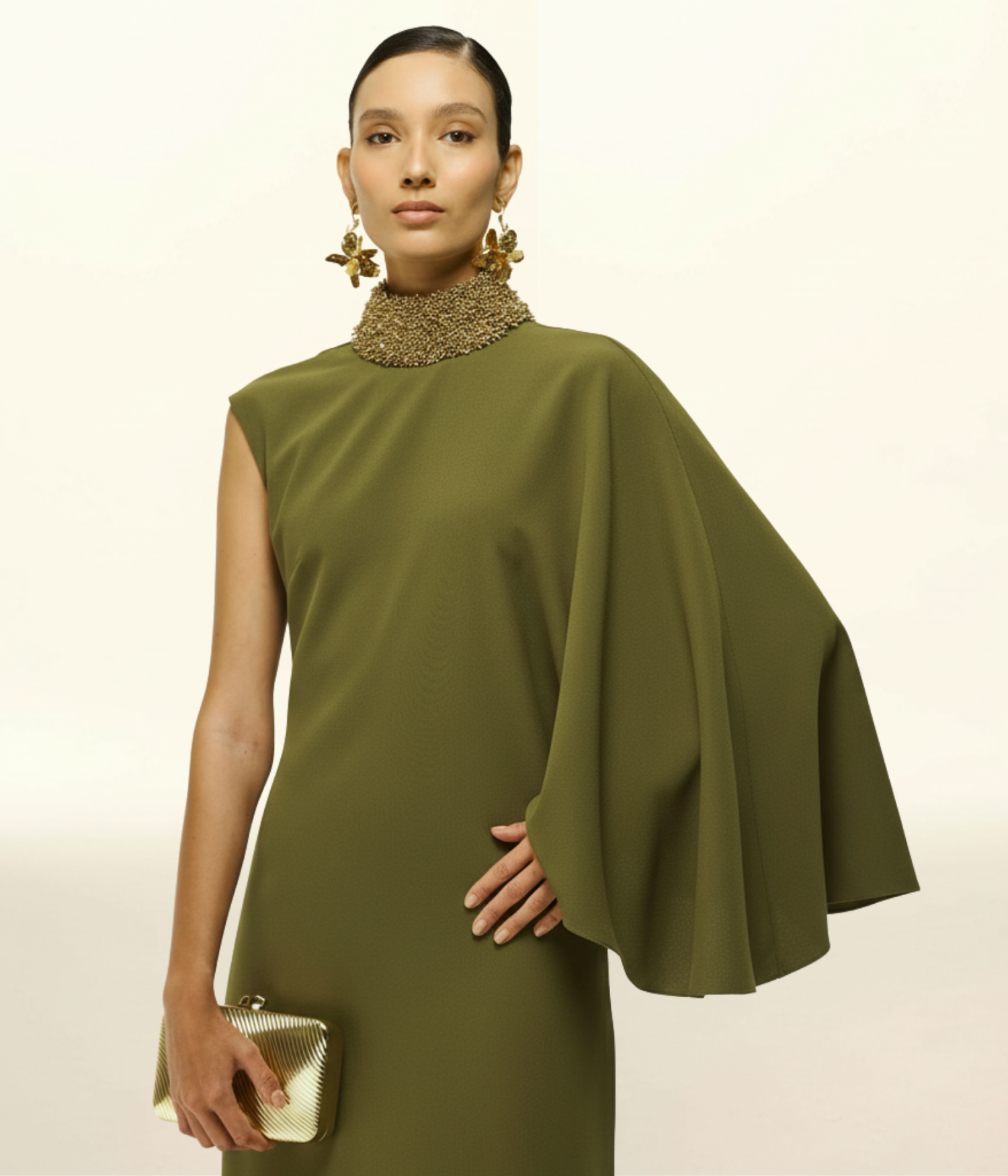 - Detalhes: Gola alta bordada, manga capa assimétrica, cintura marcada, saia alongada