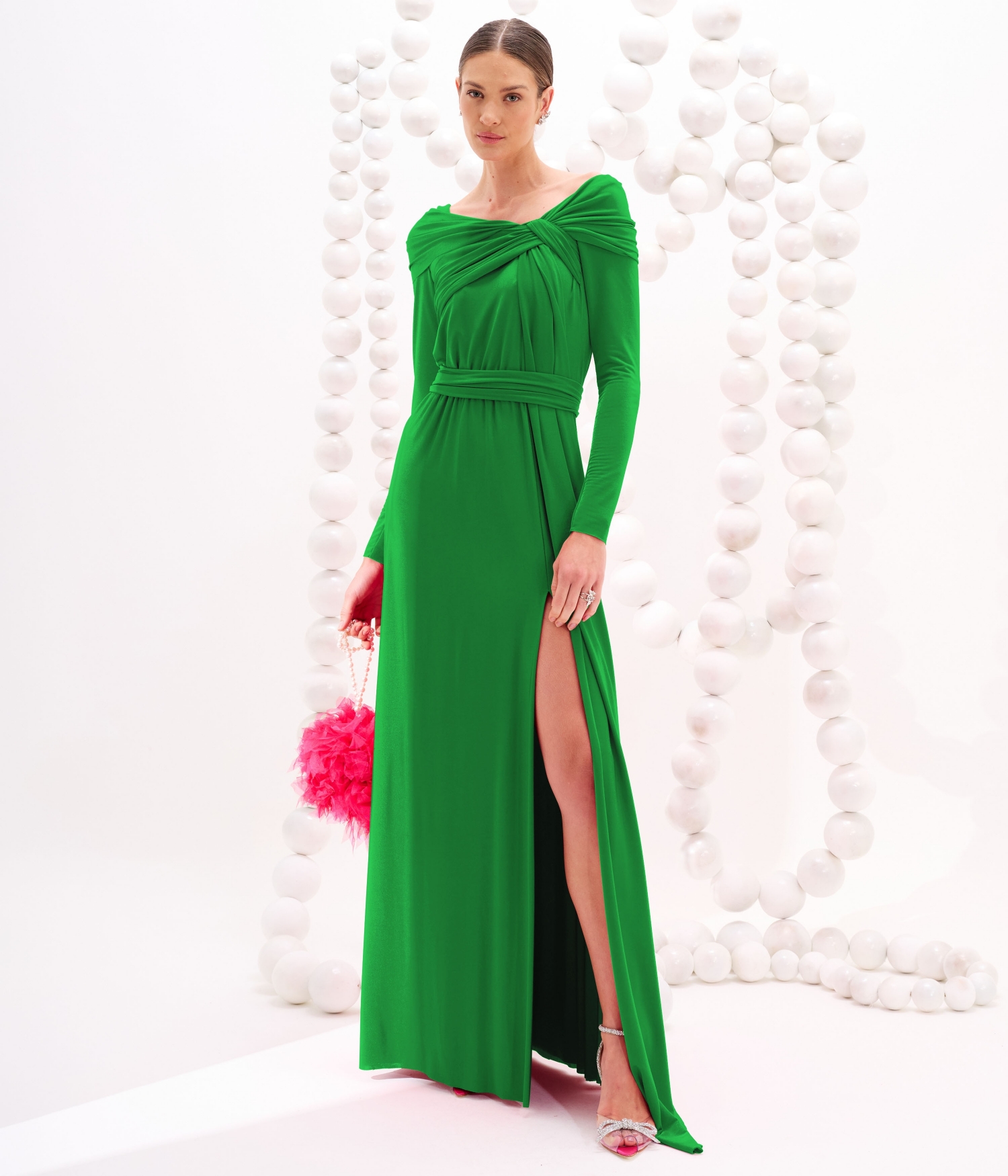Vestido de festa confeccionado em malha verde , tonalidade vibrante e sofisticada que transmite modernidade e elegância. O modelo apresenta decote drapeado que valoriza o colo e os ombros, além de mangas longas ajustadas e fenda lateral que adiciona sensualidade na medida certa. A cintura marcada realça a silhueta, enquanto o caimento fluido garante movimento e leveza ao caminhar.