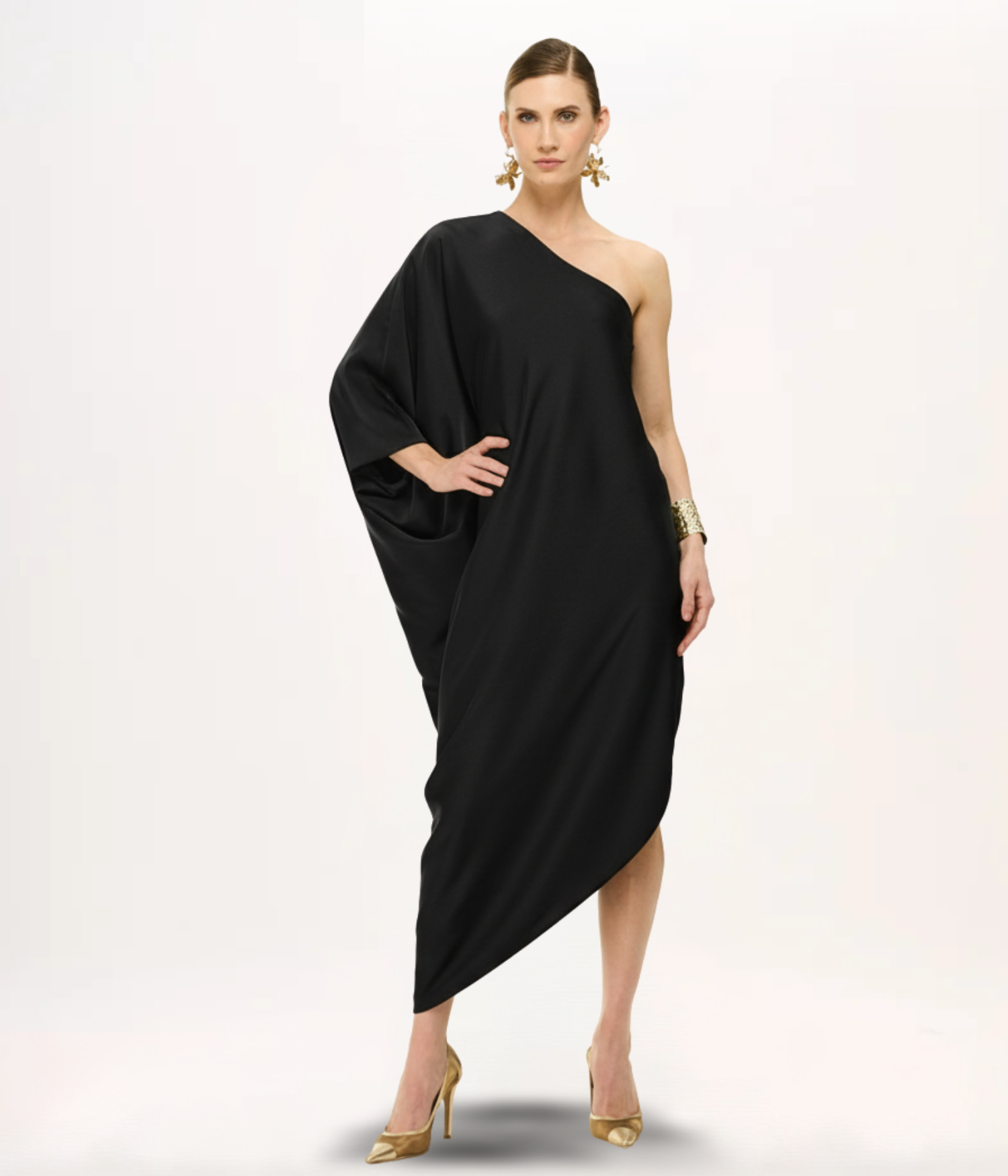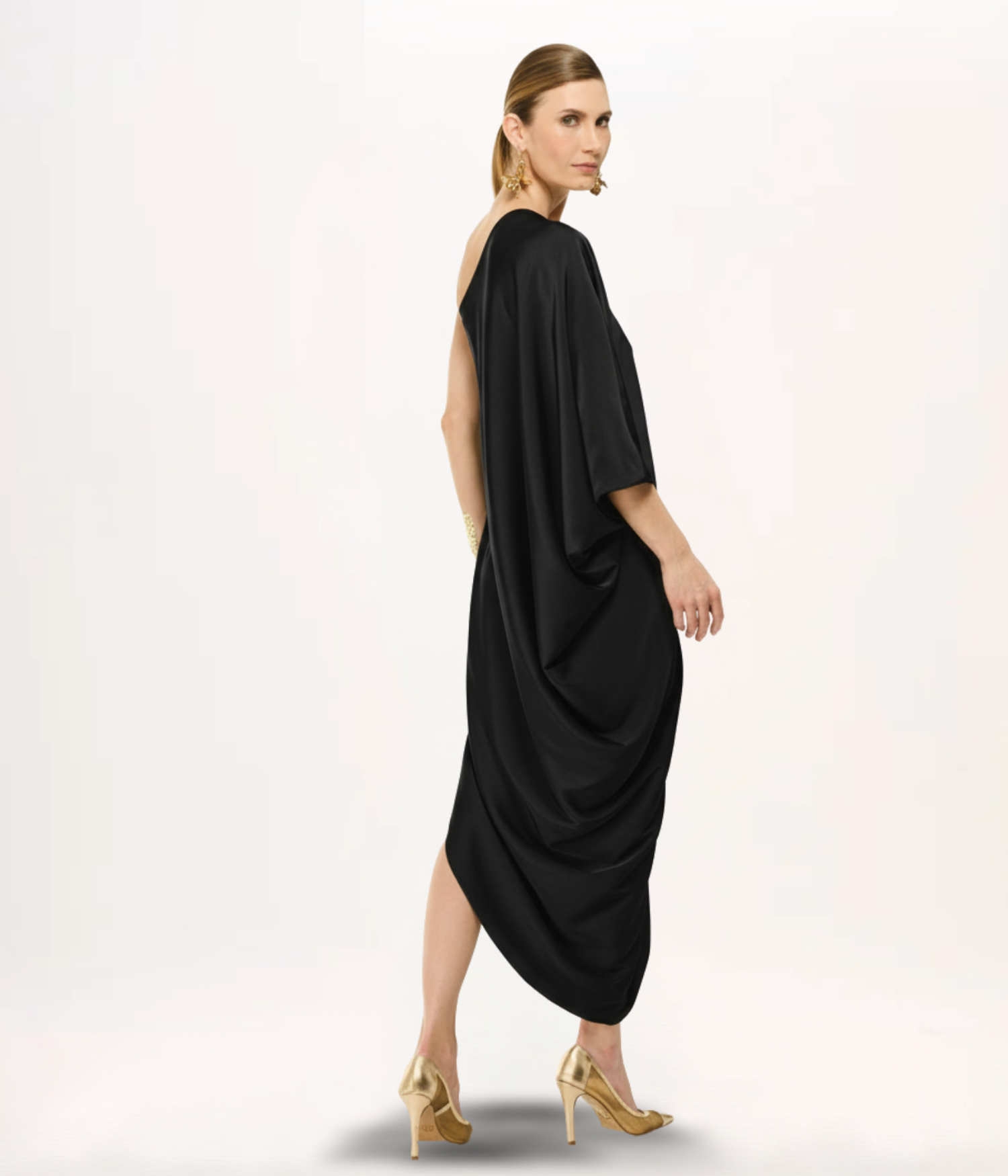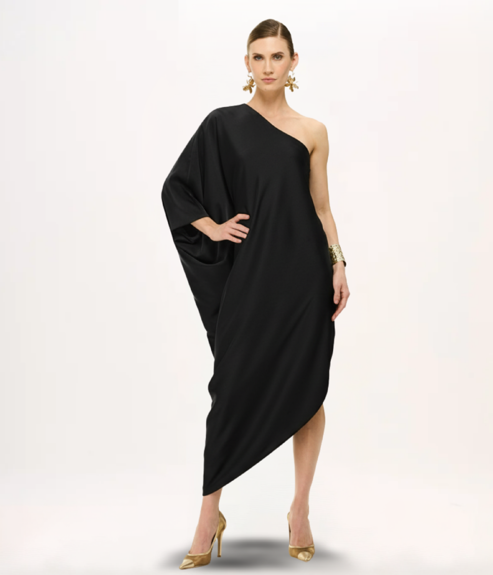 - Detalhes: Decote assimétrico de um ombro só, manga ampla drapeada, barra assimétrica em cascata