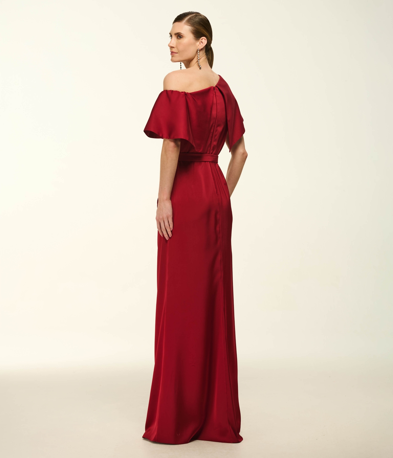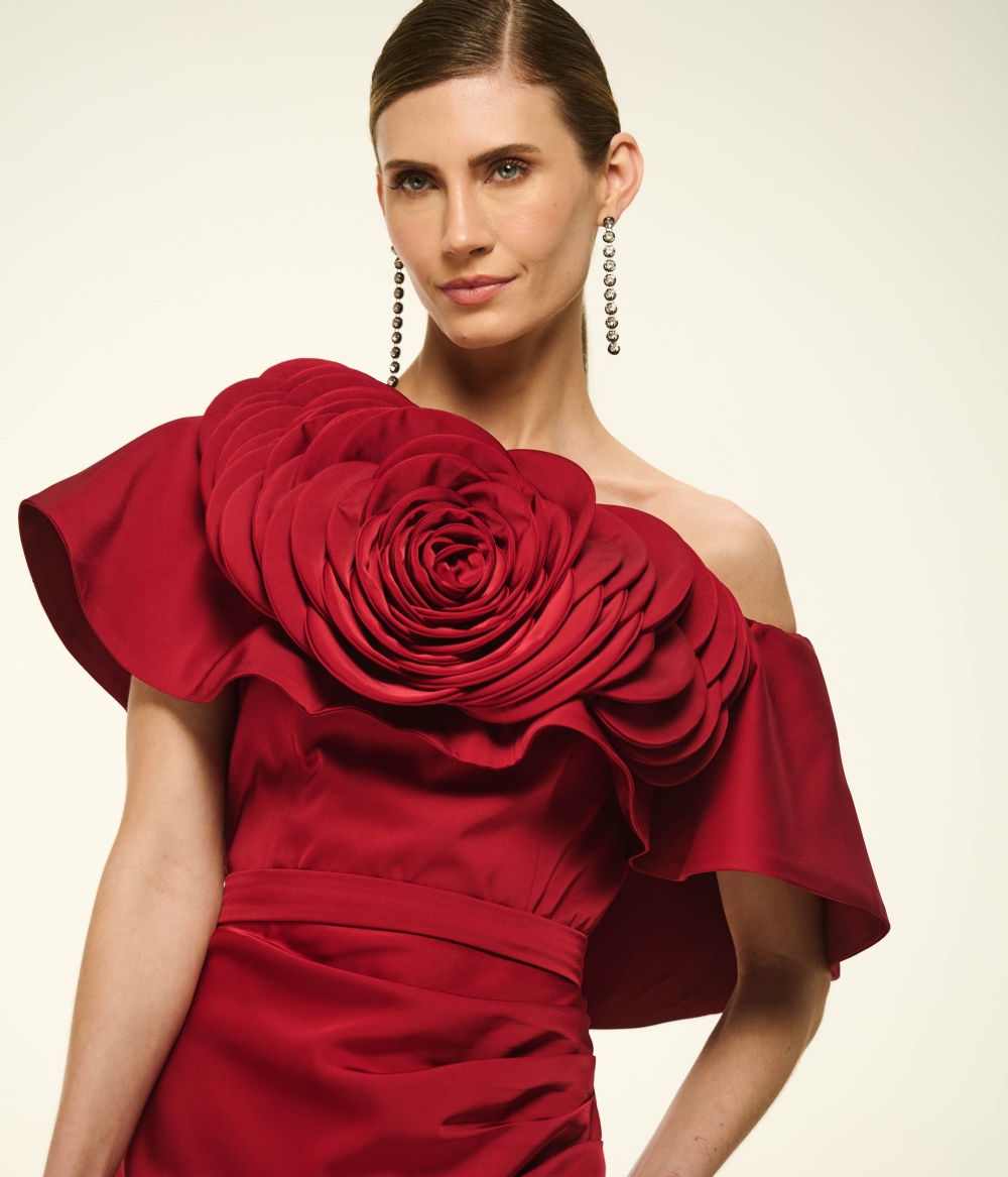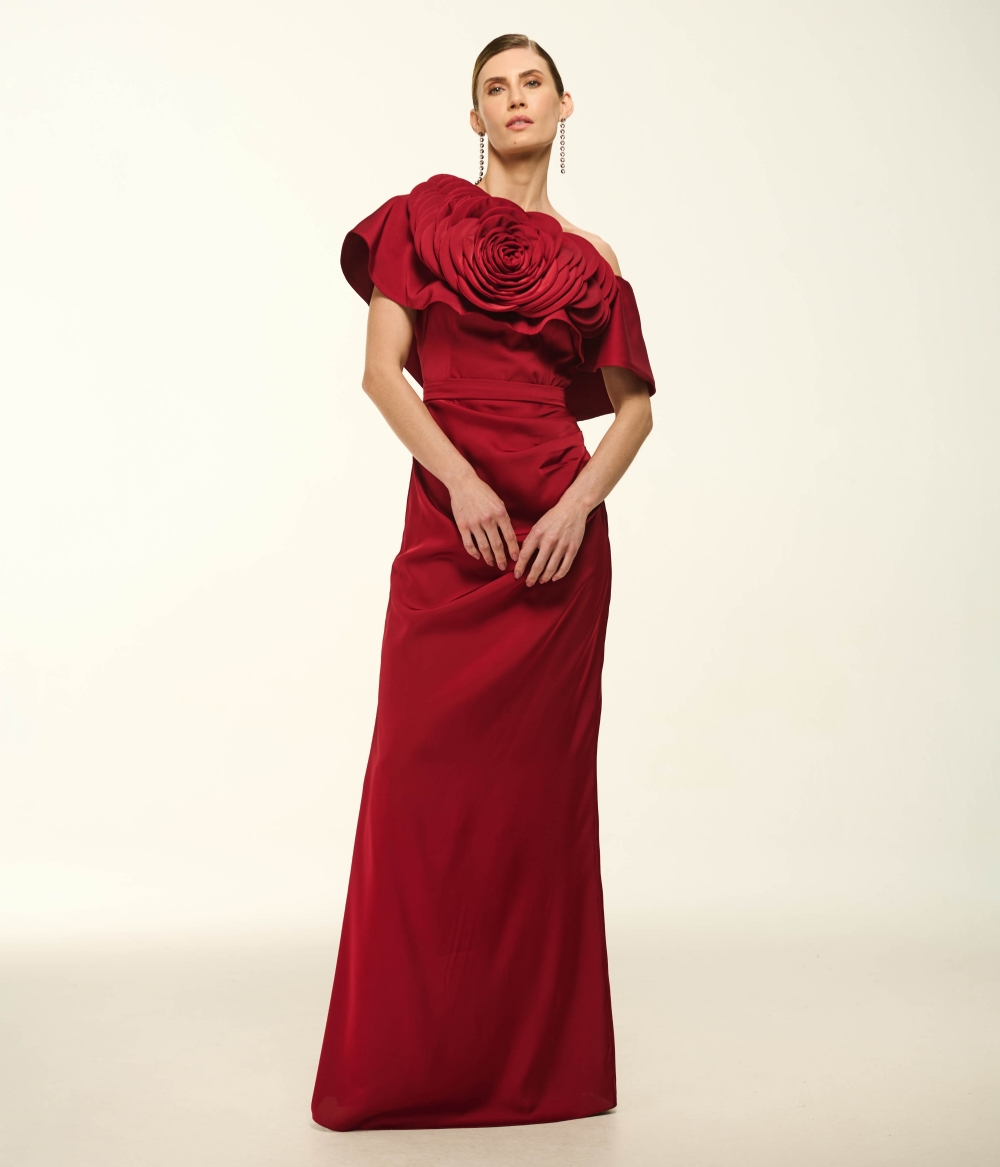 O Vestido VL341 é a materialização da elegância dramática e da arquitetura têxtil. Confeccionado em cetim fluido de brilho acetinado e toque sedoso, o modelo destaca-se por seu decote tomara que caia com um imponente trabalho escultural: dobras e pregas manuais que formam o design de uma maxi flor em relevo, emoldurando o colo com sofisticação 3D. A cintura é delicadamente marcada por um cinto no mesmo tecido, abrindo-se para uma saia longa de caimento pesado e fluido, enriquecida por um drapeado lateral que culmina em uma fenda estratégica. É a escolha definitiva para a mulher que busca uma presença magnética e um visual de passarela em eventos de alto padrão.
