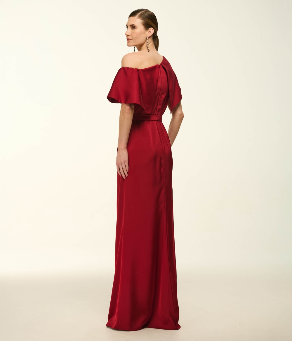 Vestido Longo em Cetim Fluido com Busto Escultural e Fenda