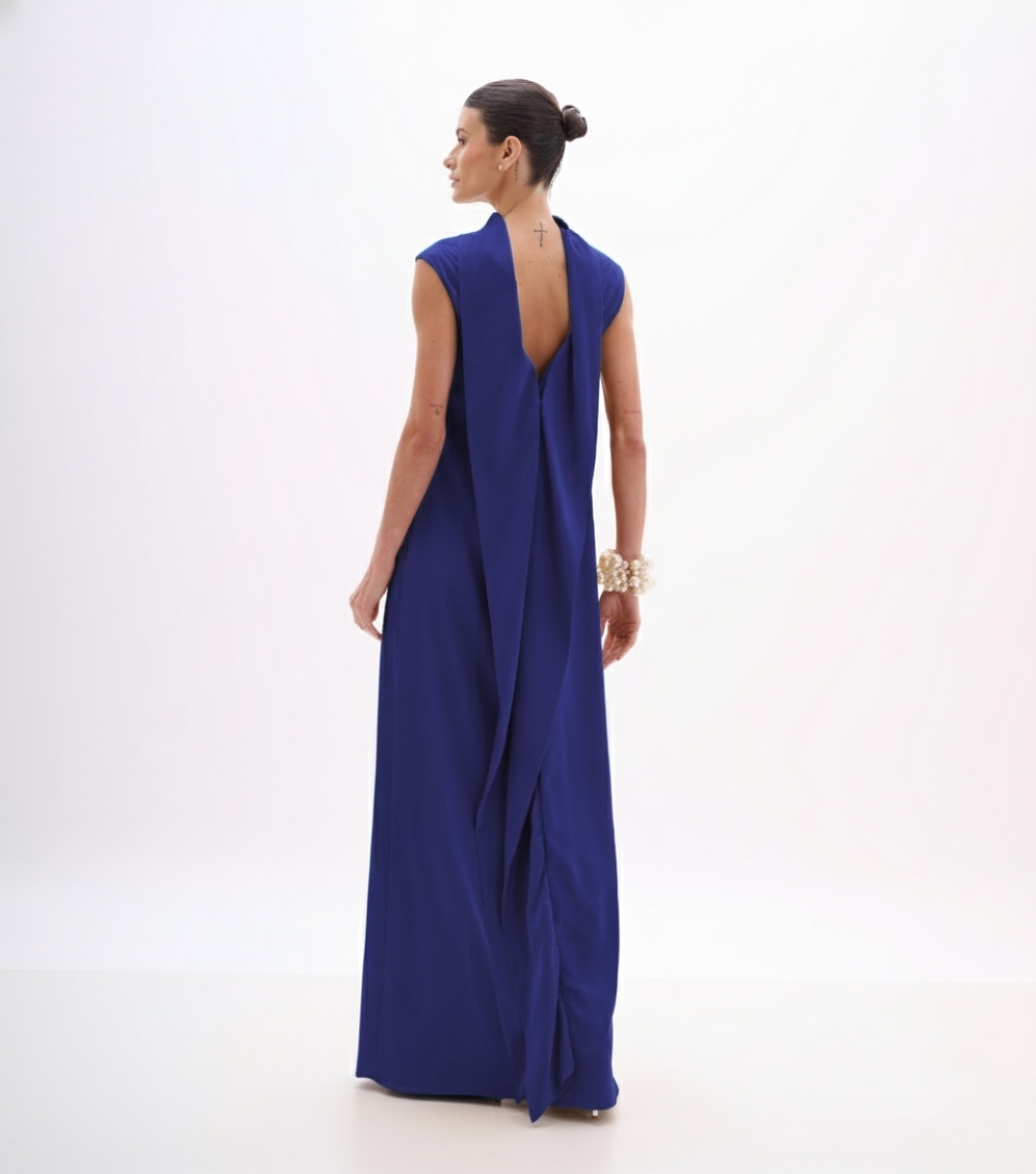 O grande destaque fica por conta do decote estruturado na parte frontal e do detalhe traseiro com recorte profundo e cauda de tecido suavemente drapeada — elementos que adicionam impacto visual sem perder a proposta clean.