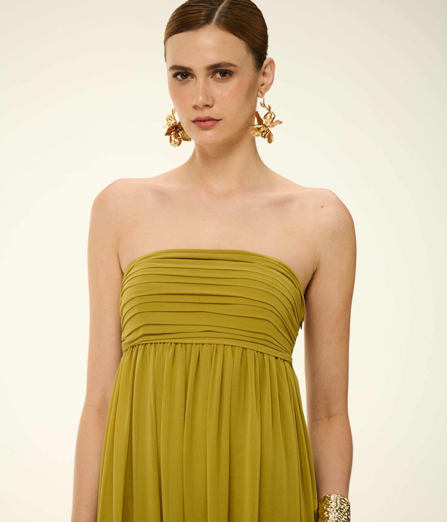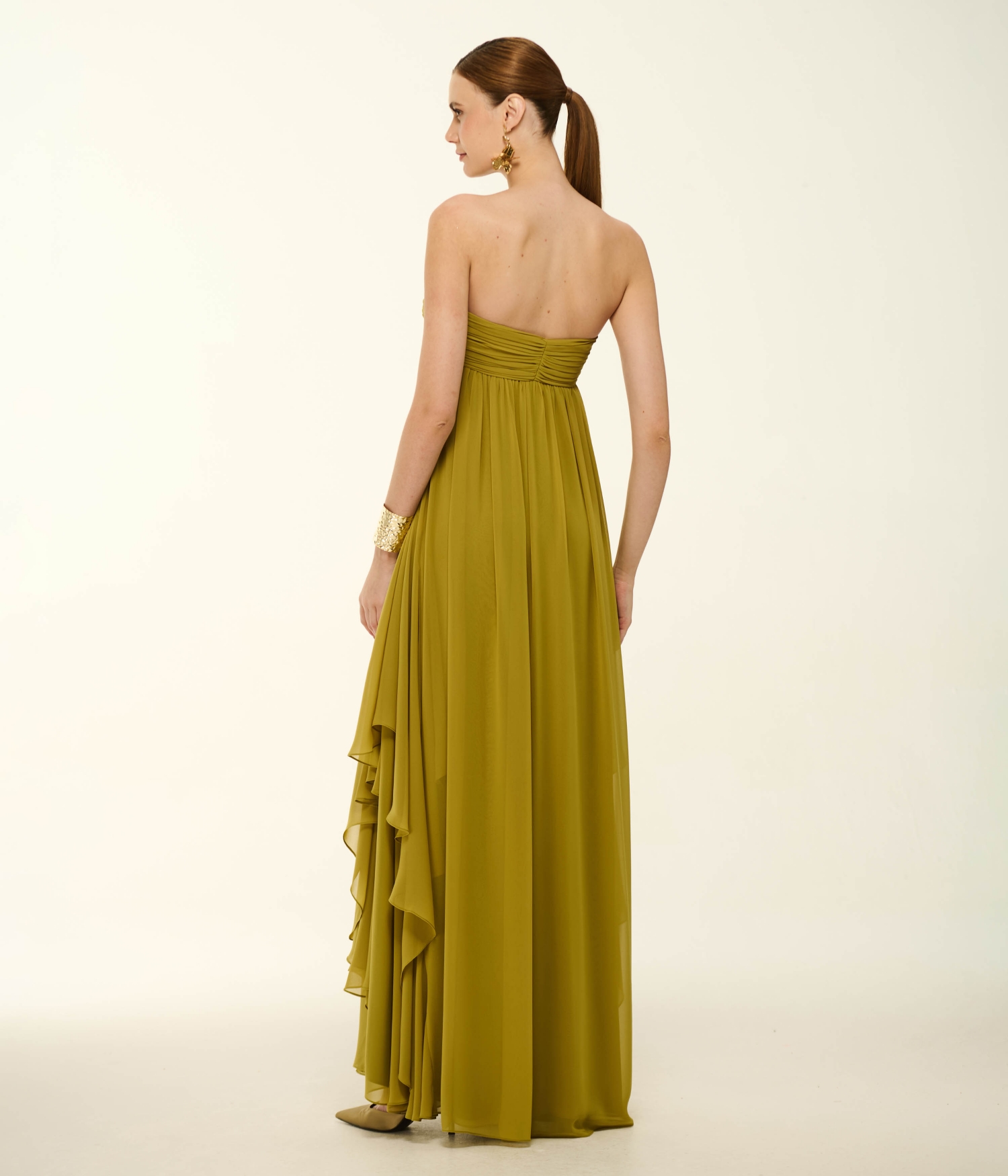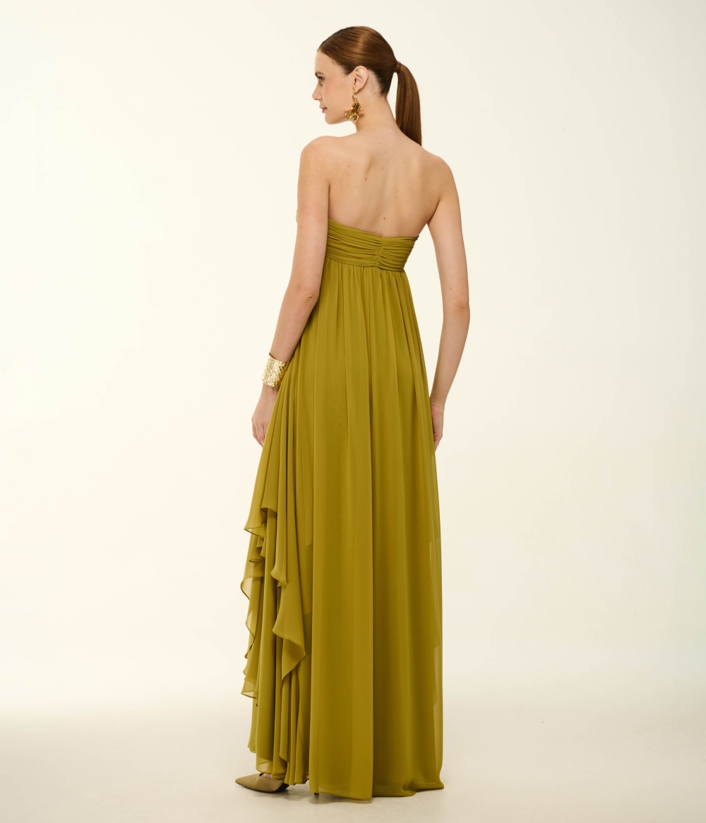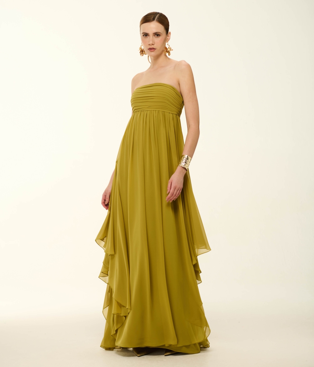 Detalhes: Corpo drapeado, tomara que caia, saia fluida com camadas assimétricas