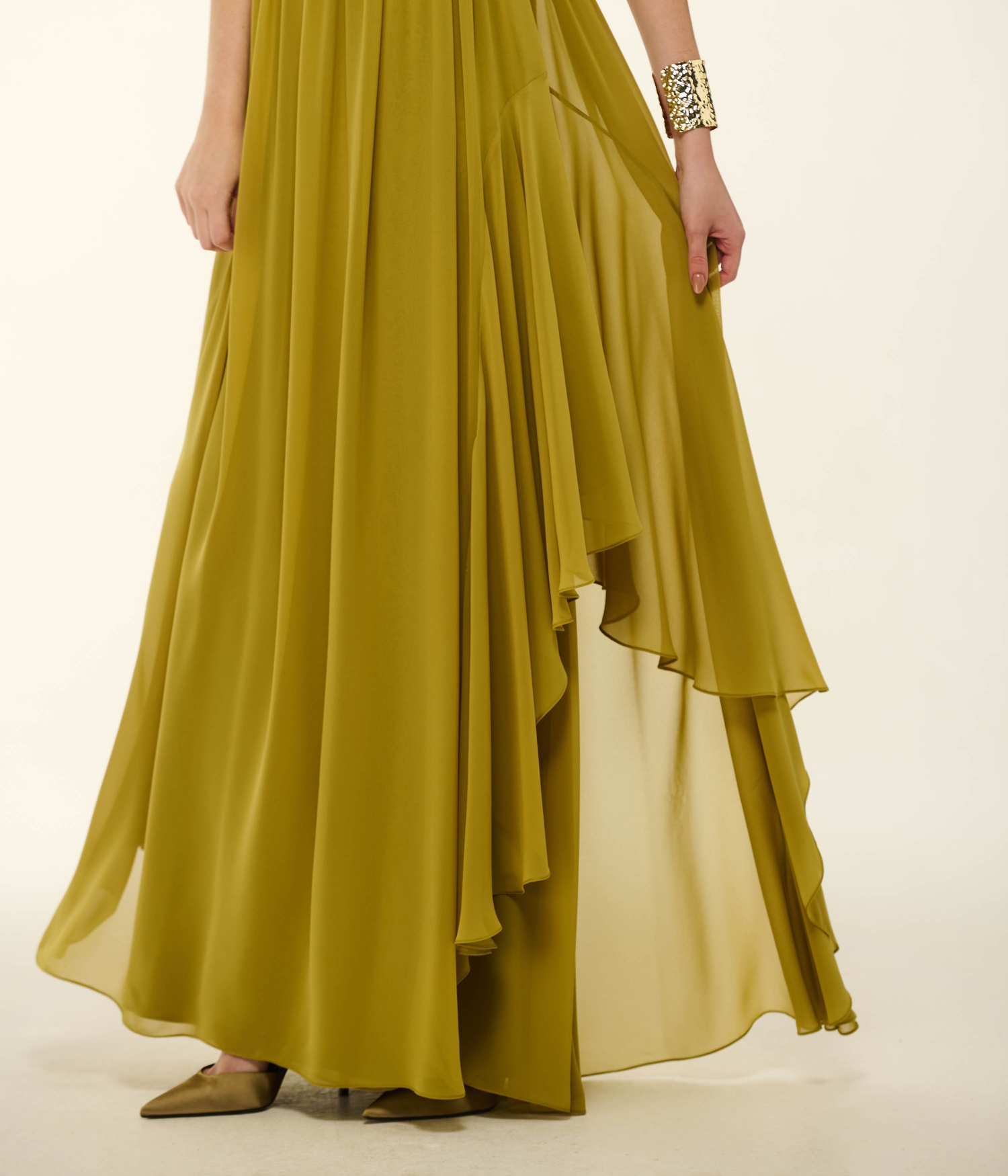 Vestido Longo em Chiffon Saab com Corpo Drapeado e Saia Eterea