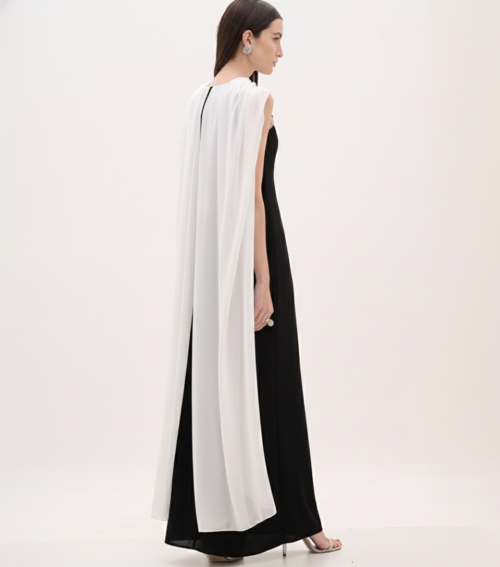 Capa removível em crepe fluido, aplicada nos ombros, proporcionando movimento leve e dramático ao caminhar.