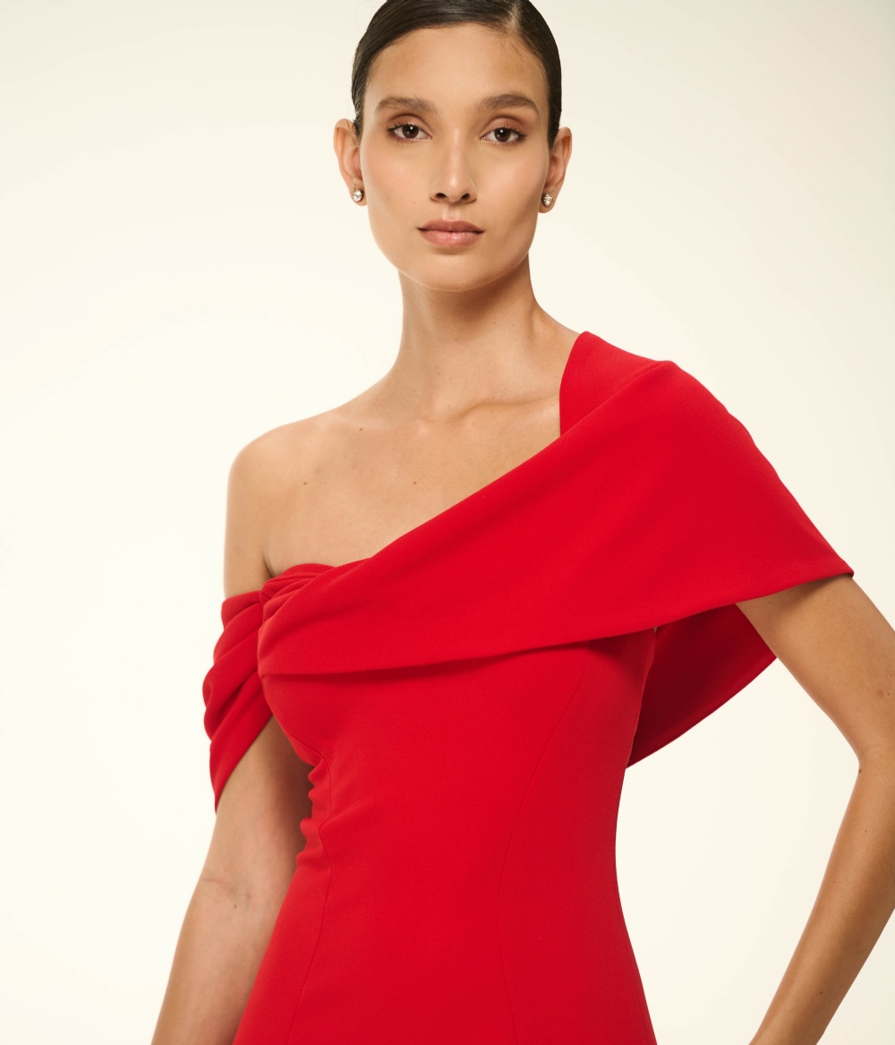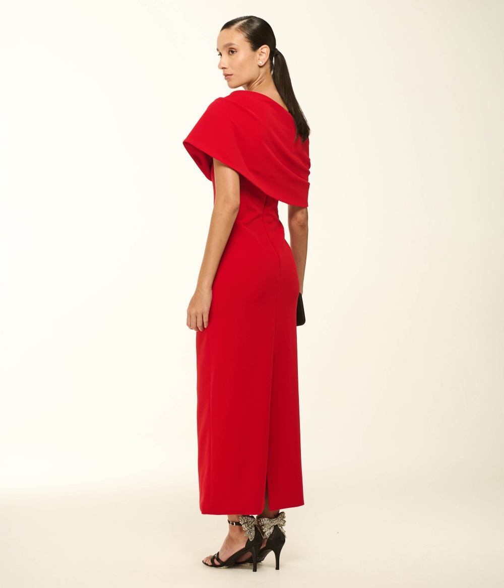 Perfeito para madrinhas contemporâneas, formandas, mães de noivos e convidadas que buscam uma estética elegante, confortável e atemporal. O vermelho fogo potencializa a presença do modelo, pedindo acessórios em metal polido ou brilho moderado, além de penteados que valorizem o decote e a verticalidade do look.