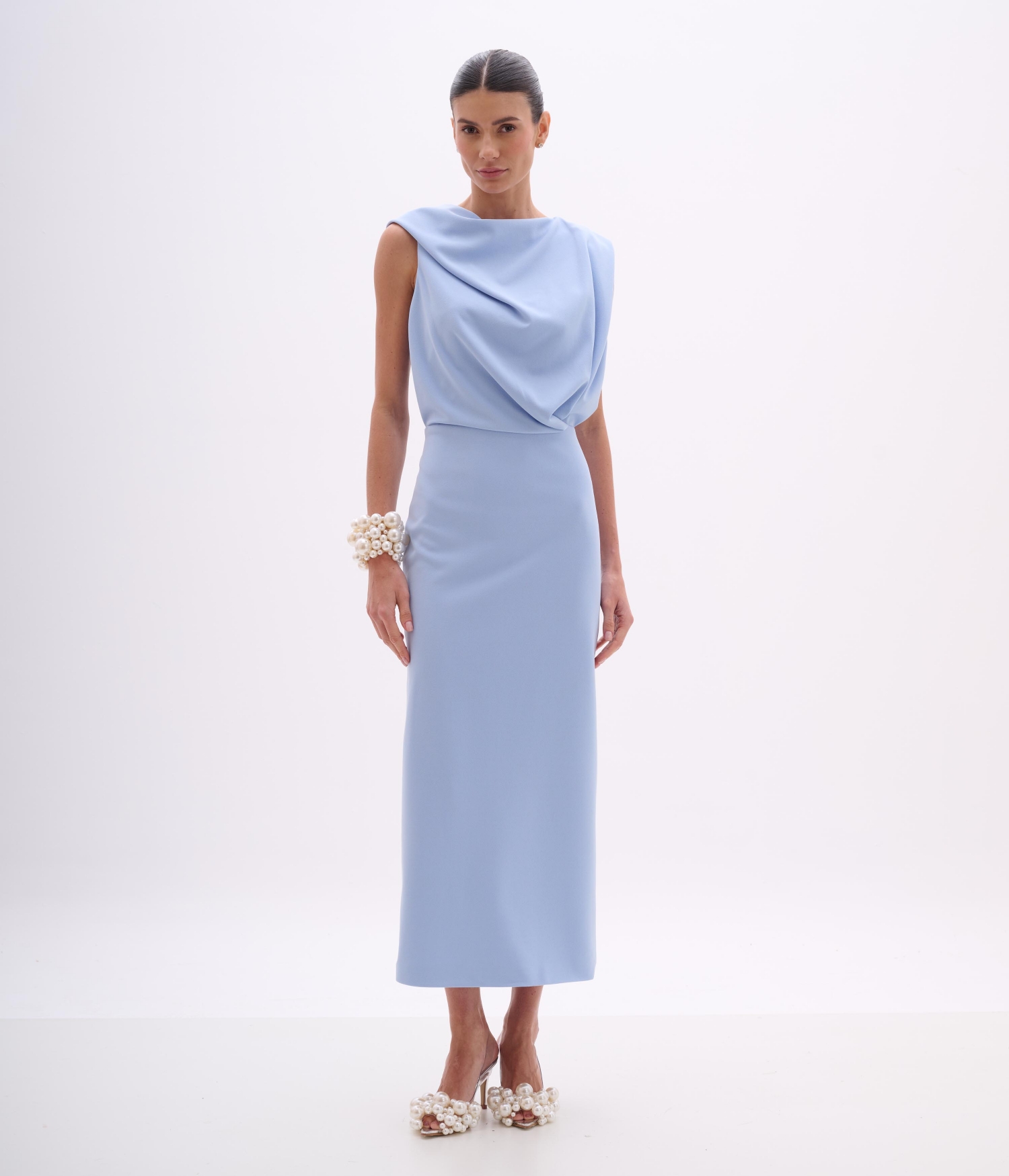 - Detalhes: Decote drapeado, sem mangas, saia longa reta