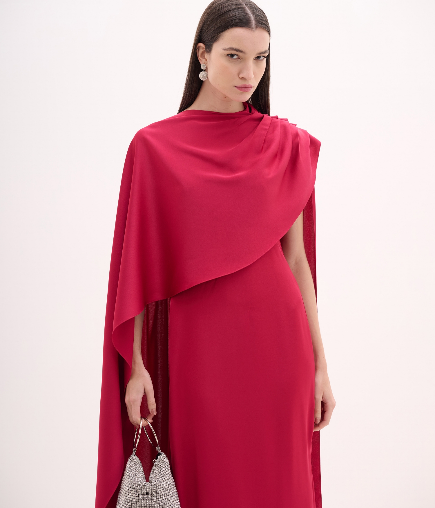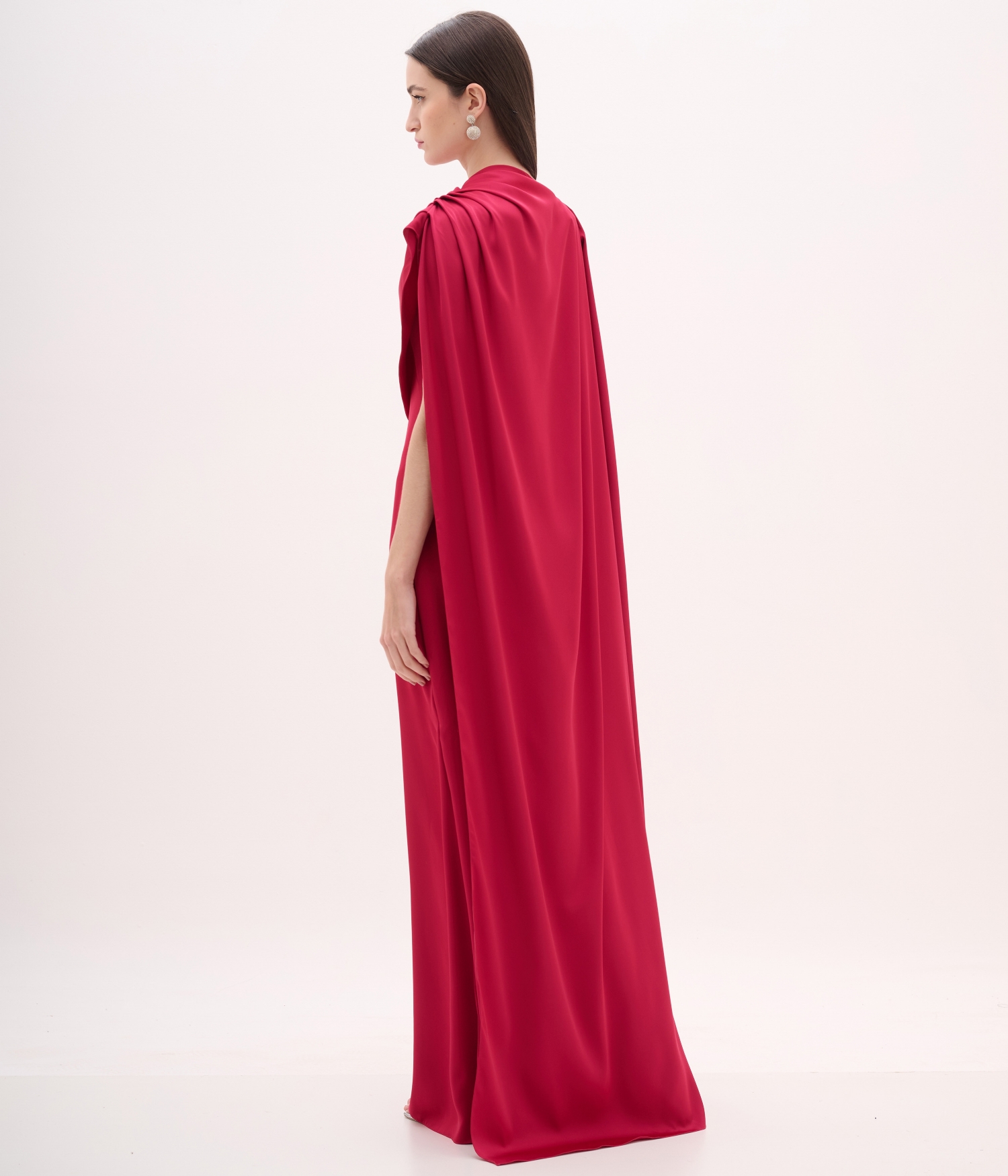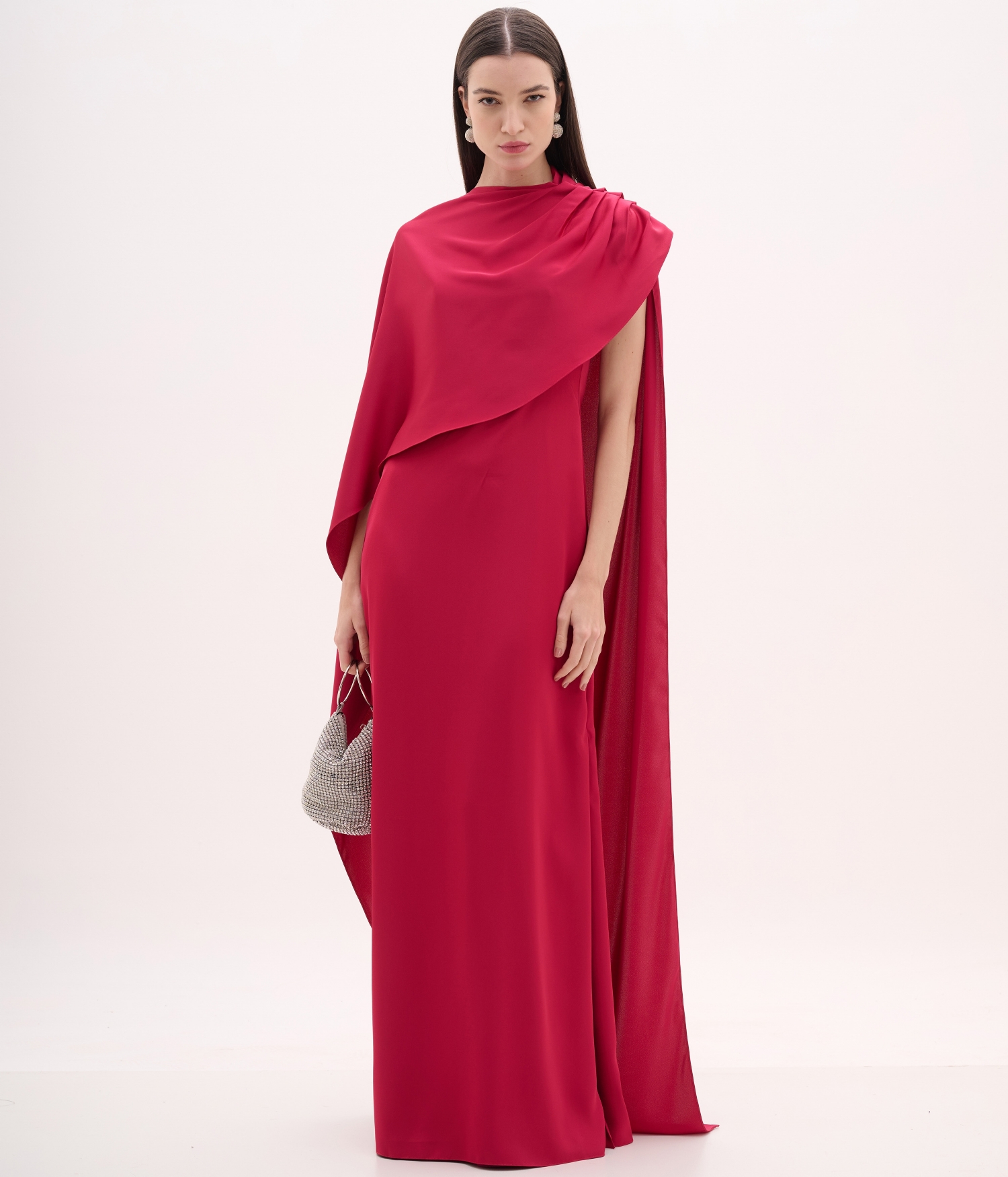Vestido longo confeccionado em crepe fluido, tecido leve, macio e com caimento elegante que acompanha o movimento do corpo. O modelo tem silhueta reta e minimalista, valorizada pela sobreposição assimétrica que cria efeito de capa.
