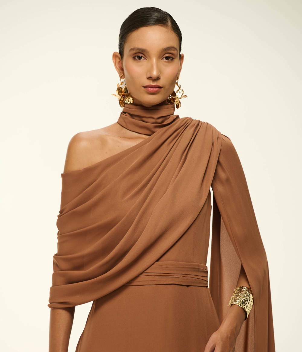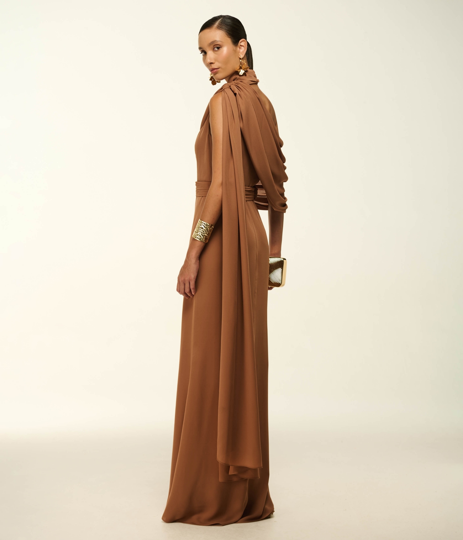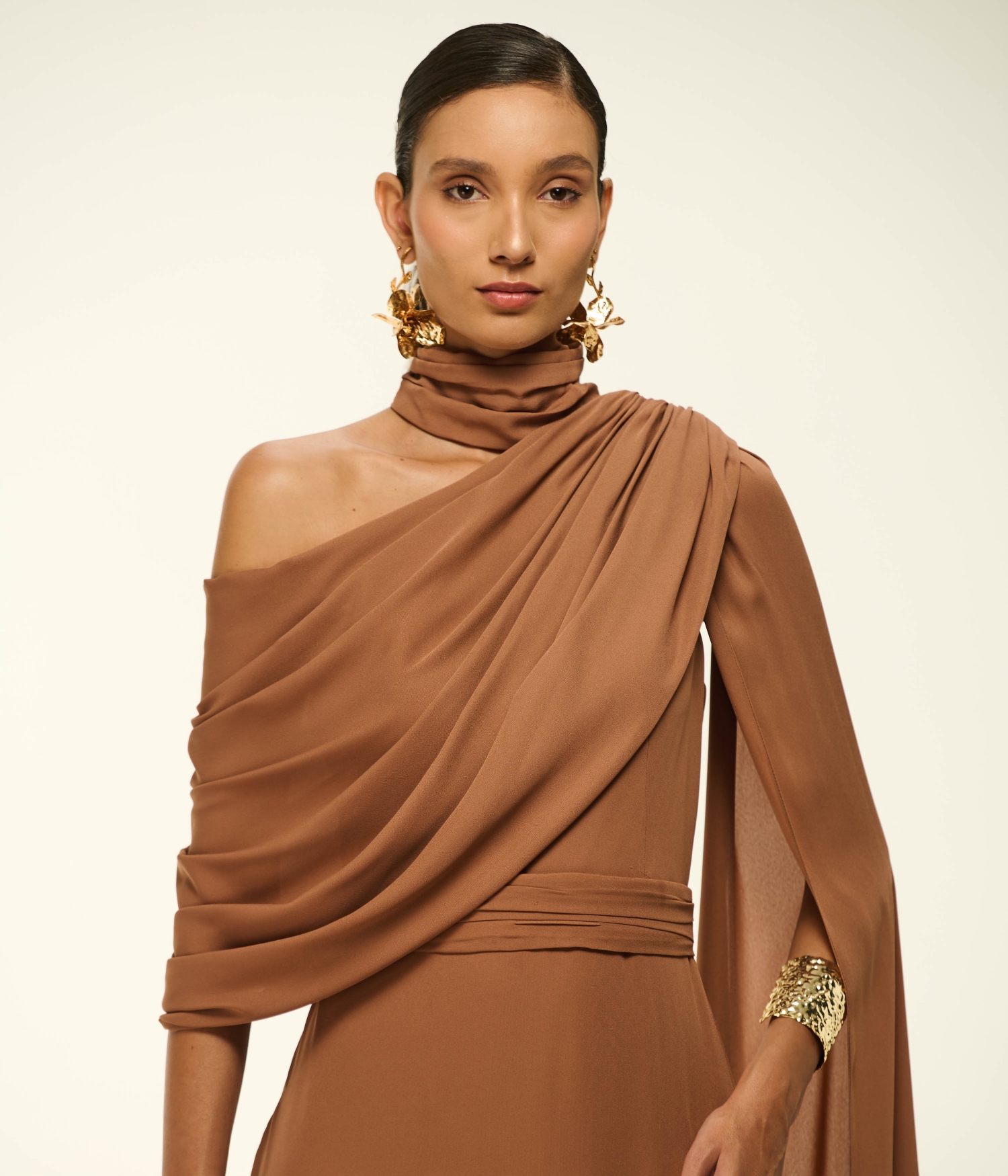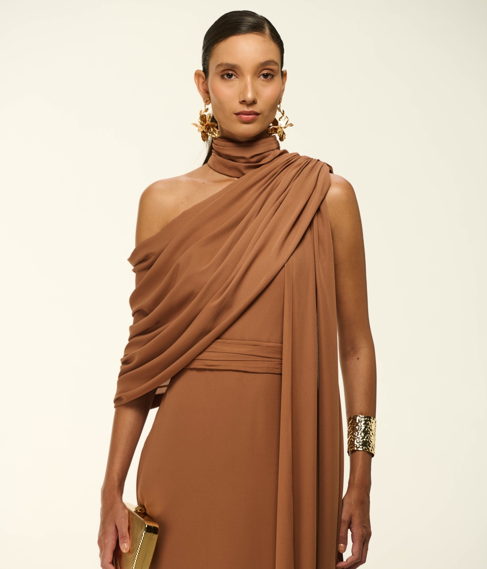 VESTIDO LONGO EM CREPE FLUIDO COM DECOTE ASSIMÉTRICO E DRAPEADO