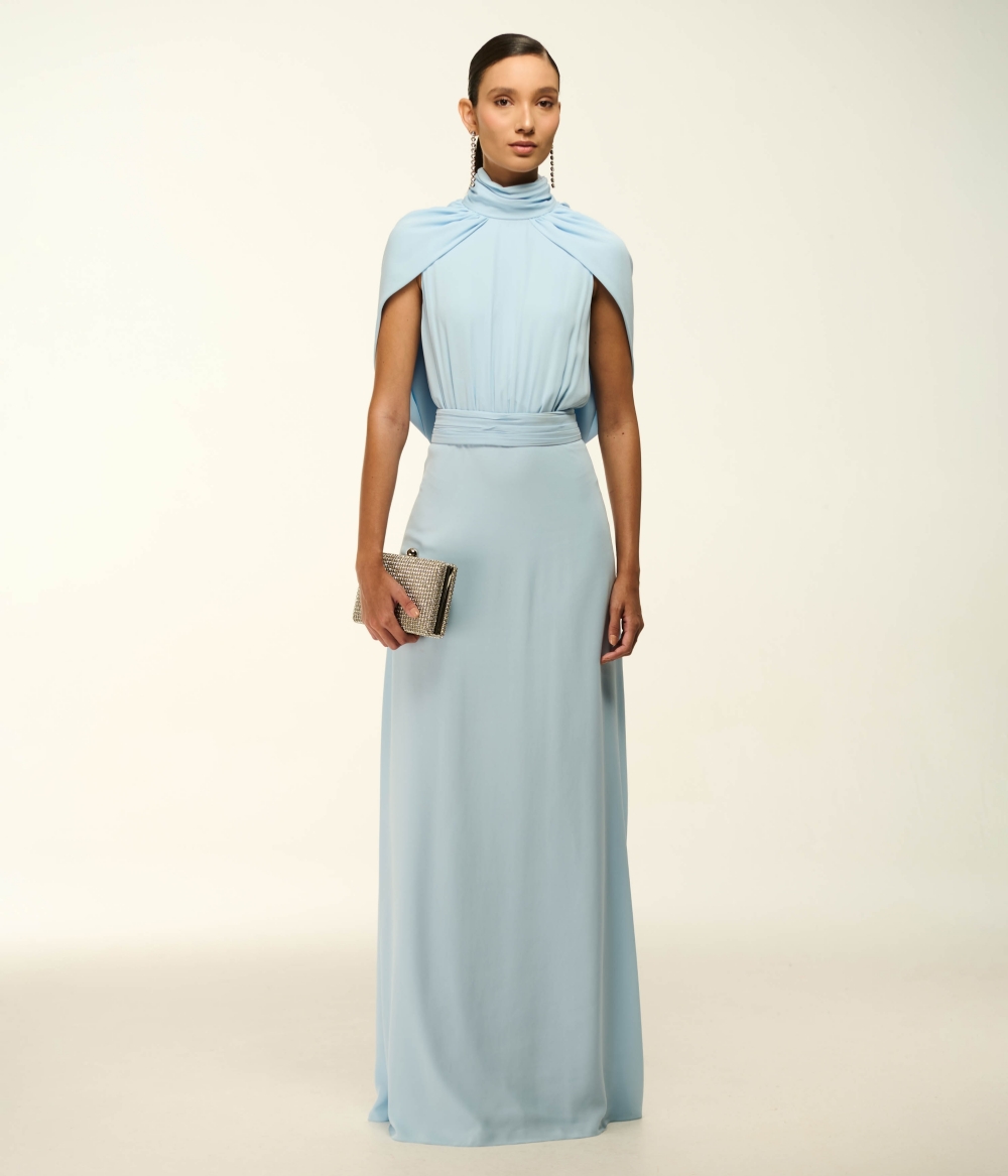 A peça ideal para madrinhas em casamentos ao ar livre, cerimonias diurnas ou entardeceres glamourosos ("Golden Hour"). O tom Cristal Blue harmoniza-se majestosamente com joias em prata, ródio branco ou cristais translúcidos. Devido ao decote degagê e às mangas capa, opte por cabelos polidos e presos (como um rabo de cavalo alto ou coque) para deixar a arquitetura das costas em evidência. Finalize com sandálias de tiras finas e uma clutch metálica minimalista.