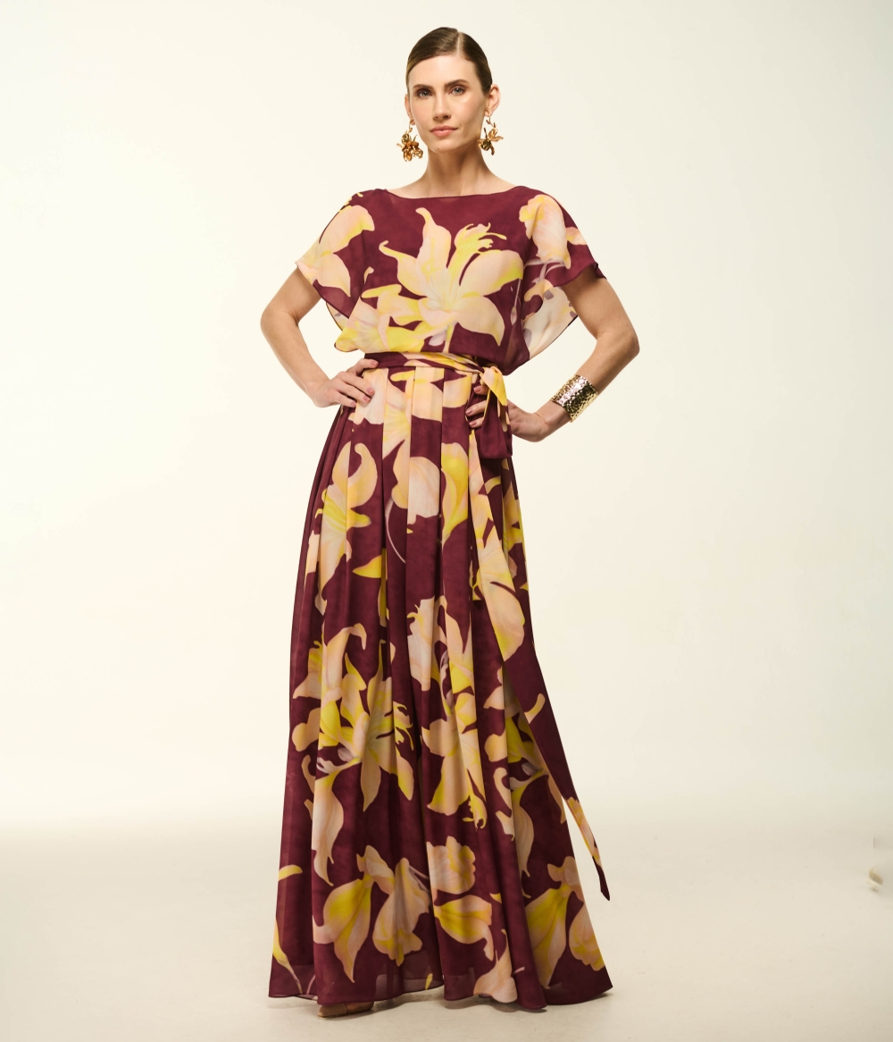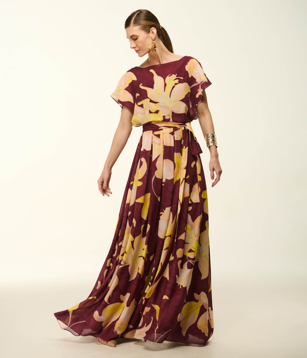 Vestido Longo em Crepe Fluido com Estampa Orquídea Vignon