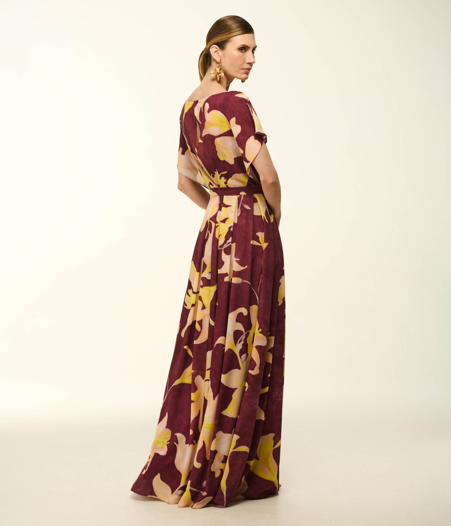 O Vestido VL329 é a celebração da feminilidade romântica unida à fluidez impecável da alta costura. Confeccionado em crepe fluido de caimento etéreo e leveza ímpar, o modelo apresenta um decote em V que valoriza o colo de forma sofisticada e alonga visualmente a silhueta. As mangas longas e soltas trazem uma elegância clássica e cobrem os braços com graça, perfeitamente equilibradas pela saia longa de movimento contínuo e esvoaçante. A peça é inteligentemente forrada para garantir conforto tátil e segurança absoluta. O grande espetáculo visual é a estampa exclusiva Orquídea Vignon: uma padronagem floral autoral e majestosa, rica em profundidade e detalhes, que exala um luxo artístico e envolvente. Um cinto faixa no mesmo tecido permite a marcação da cintura, criando uma proporção harmônica e escultural.