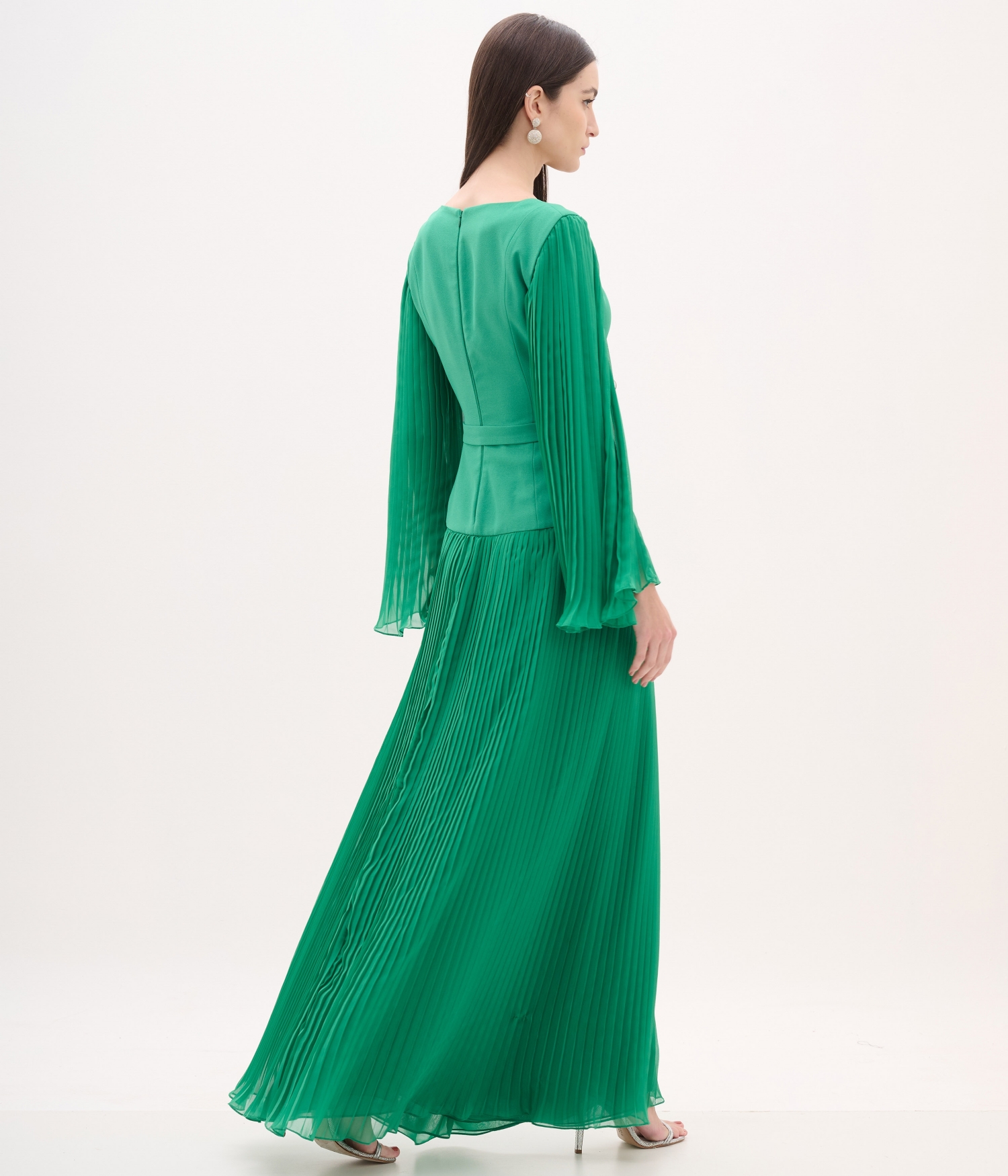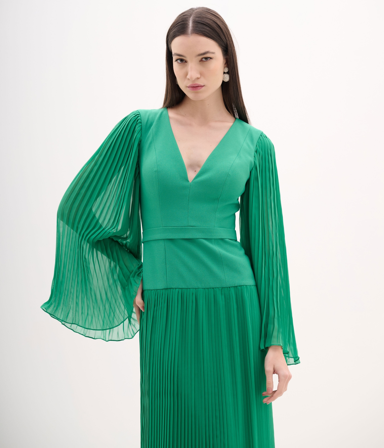 As mangas longas plissadas, confeccionadas em tecido leve e translúcido, adicionam delicadeza e movimento ao visual, trazendo um efeito etéreo a cada gesto. A saia longa plissada alonga a silhueta e garante um caimento impecável, ideal para ocasiões especiais.