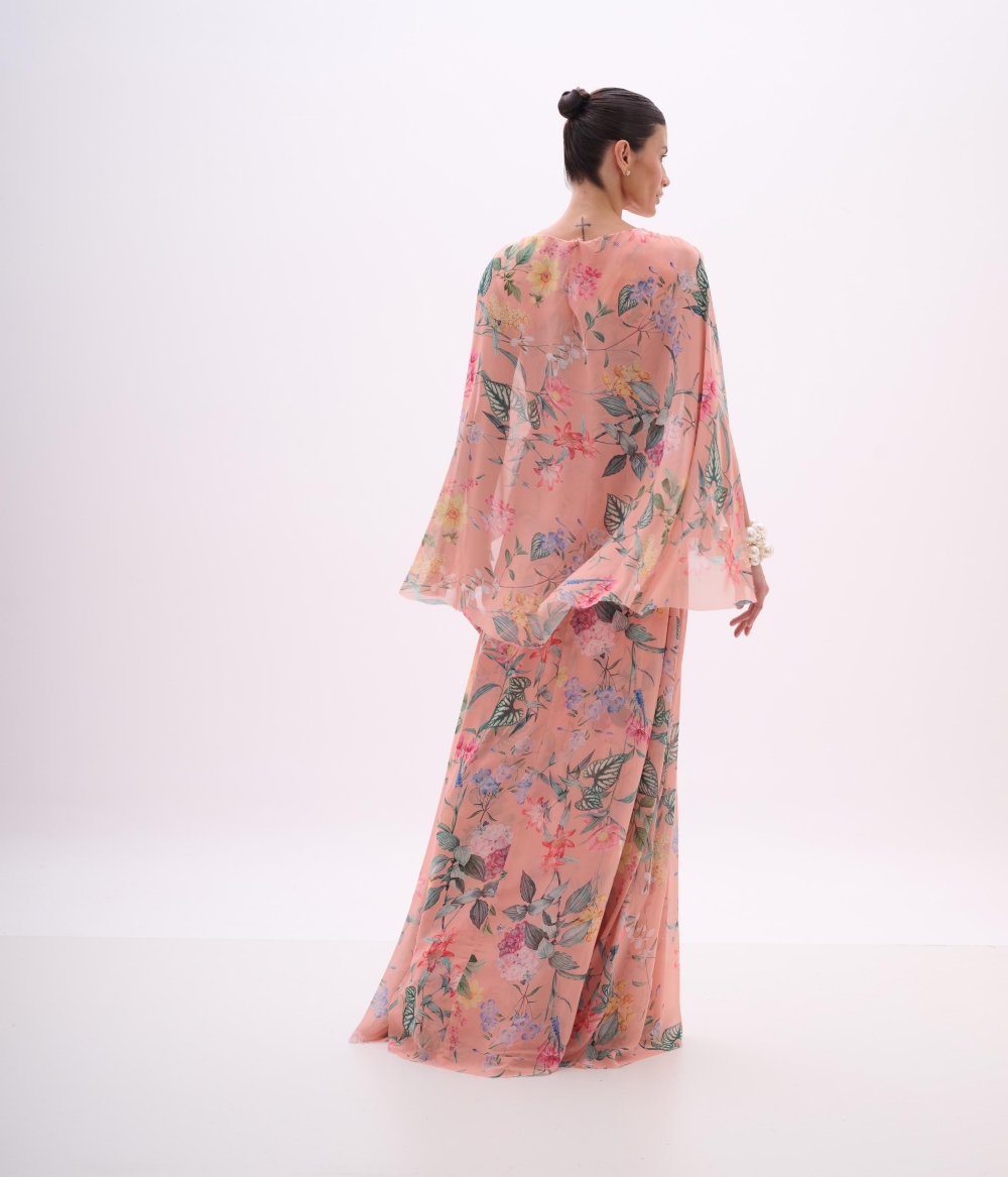 O Vestido Longo VL10080 é a expressão máxima de feminilidade e alegria. Confeccionado em musseline de toque sedoso, o tecido oferece uma fluidez inigualável que dá vida à estampa exclusiva a cada movimento. A paleta de cores foi cuidadosamente pensada para iluminar: sobre um fundo coral suave (pêssego), desabrocha um jardim vibrante com flores em tons de magenta, lavanda e amarelo solar, harmonizadas por folhagens em verde esmeralda e oliva. O destaque do design fica por conta das mangas com efeito "capa" (pelerine), que trazem leveza e cobrem os braços com transparência e elegância, dispensando o uso de estolas.