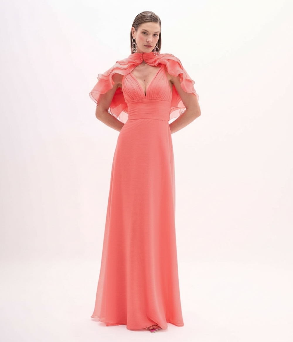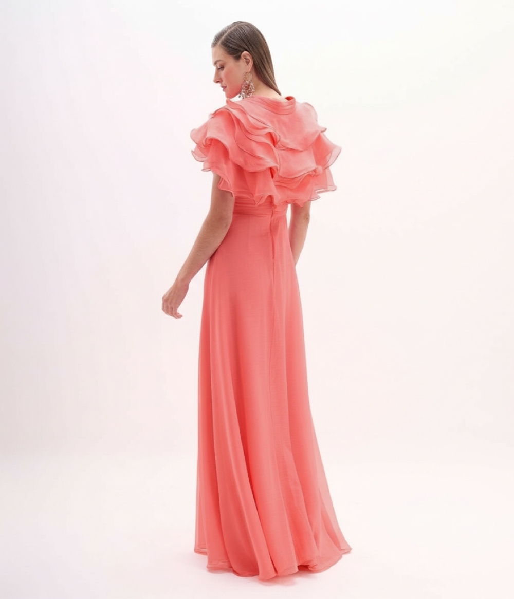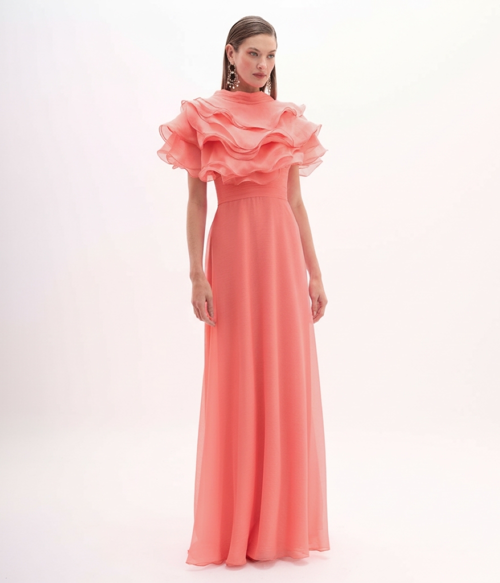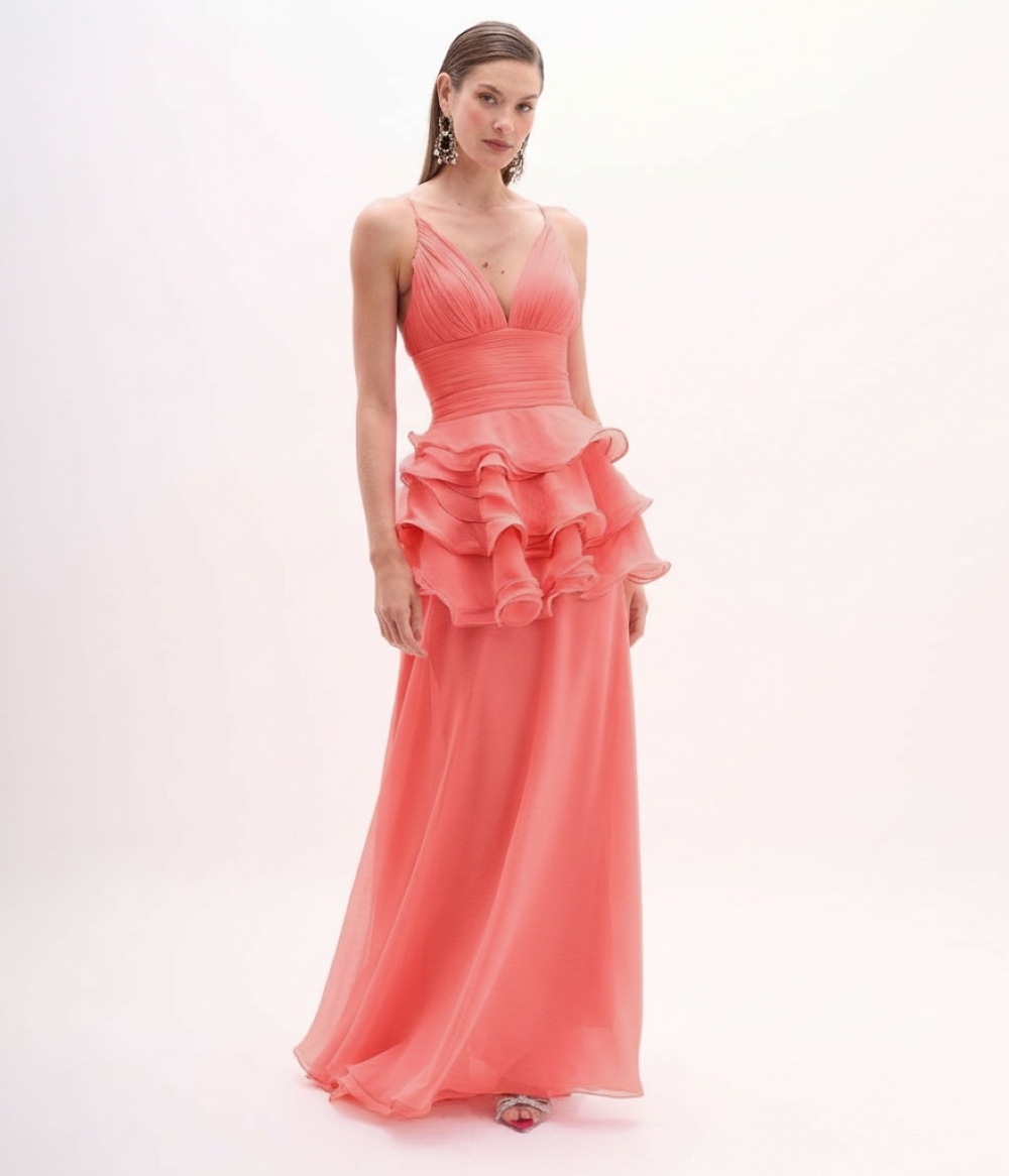 O Vestido Longo VL9228 é um encontro entre inovação e elegância linear. Confeccionado em Musseline Texturizada com tramas em linhas, o tecido oferece uma leveza sofisticada com um sutil relevo vertical que alonga a silhueta. O design ganha versatilidade máxima com o Basque Removível: uma peça chave que transforma o look. Pode ser usada na cintura, onde as linhas do tecido acompanham o volume do babado criando um efeito arquitetônico, ou nos ombros como uma capa (pelerine), aproveitando a fluidez das listras da trama para um caimento impecável.