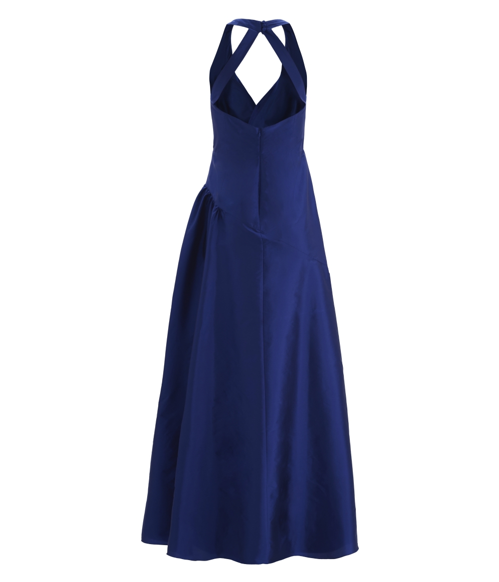Vestido Longo em Tafetá Azul Royal com Decote Profundo e Drapeado Lateral