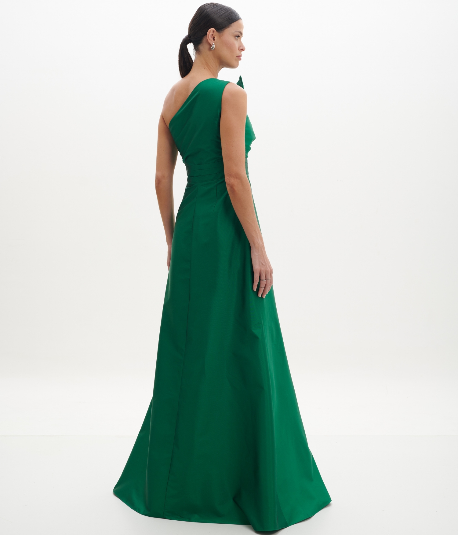Vestido Longo em Tafetá Verde Bandeira com Decote Assimétrico Plissado