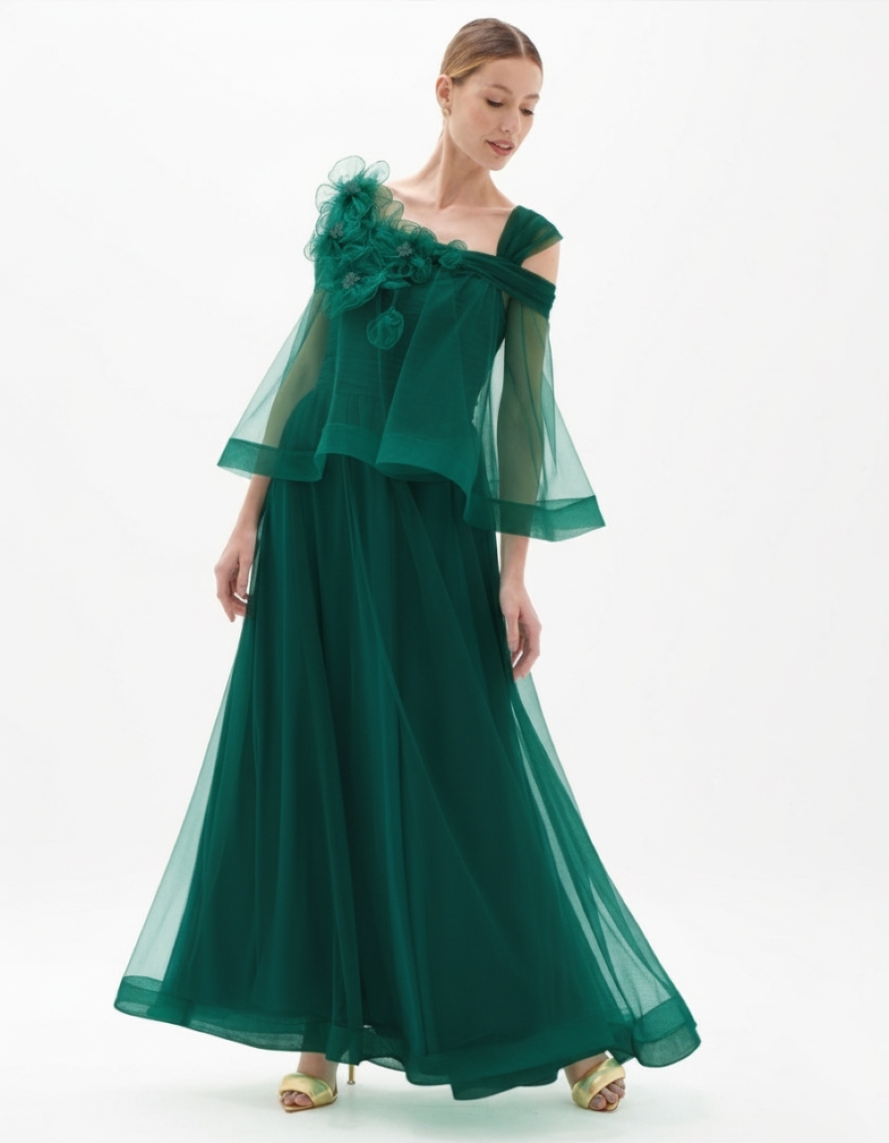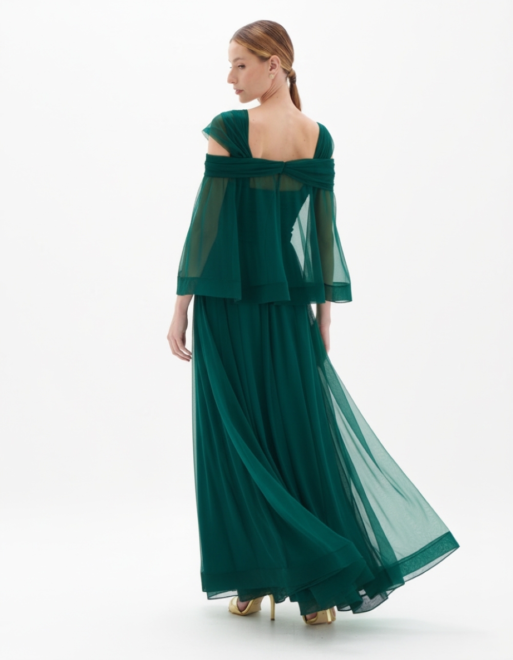 Vestido de festa deslumbrante, confeccionado em tule leve e fluido, que garante um caimento esvoaçante e etéreo. A peça se destaca pela cor verde esmeralda profunda e intensa, conferindo uma imagem de luxo e sofisticação.
