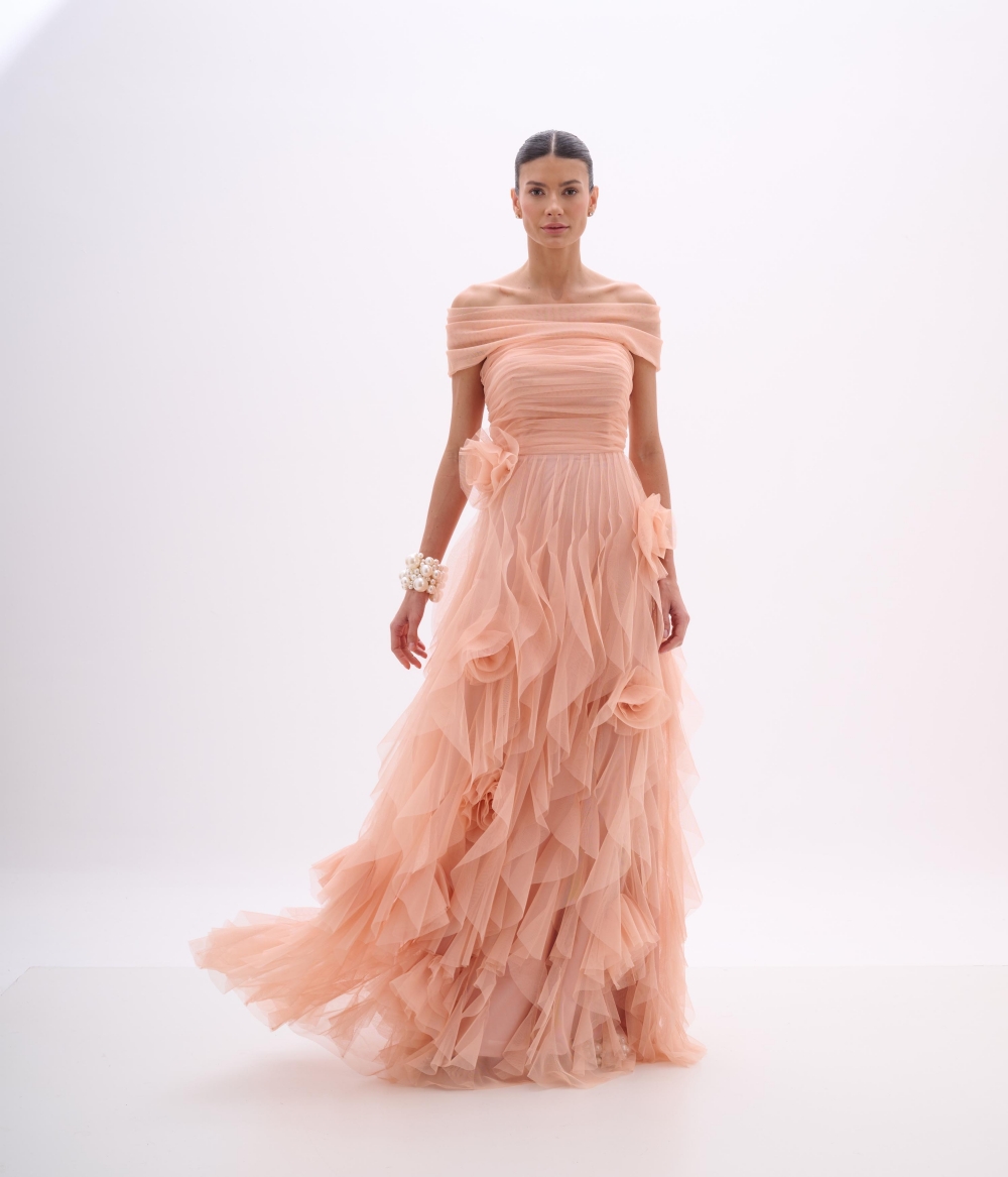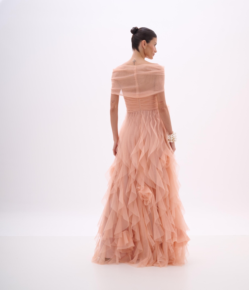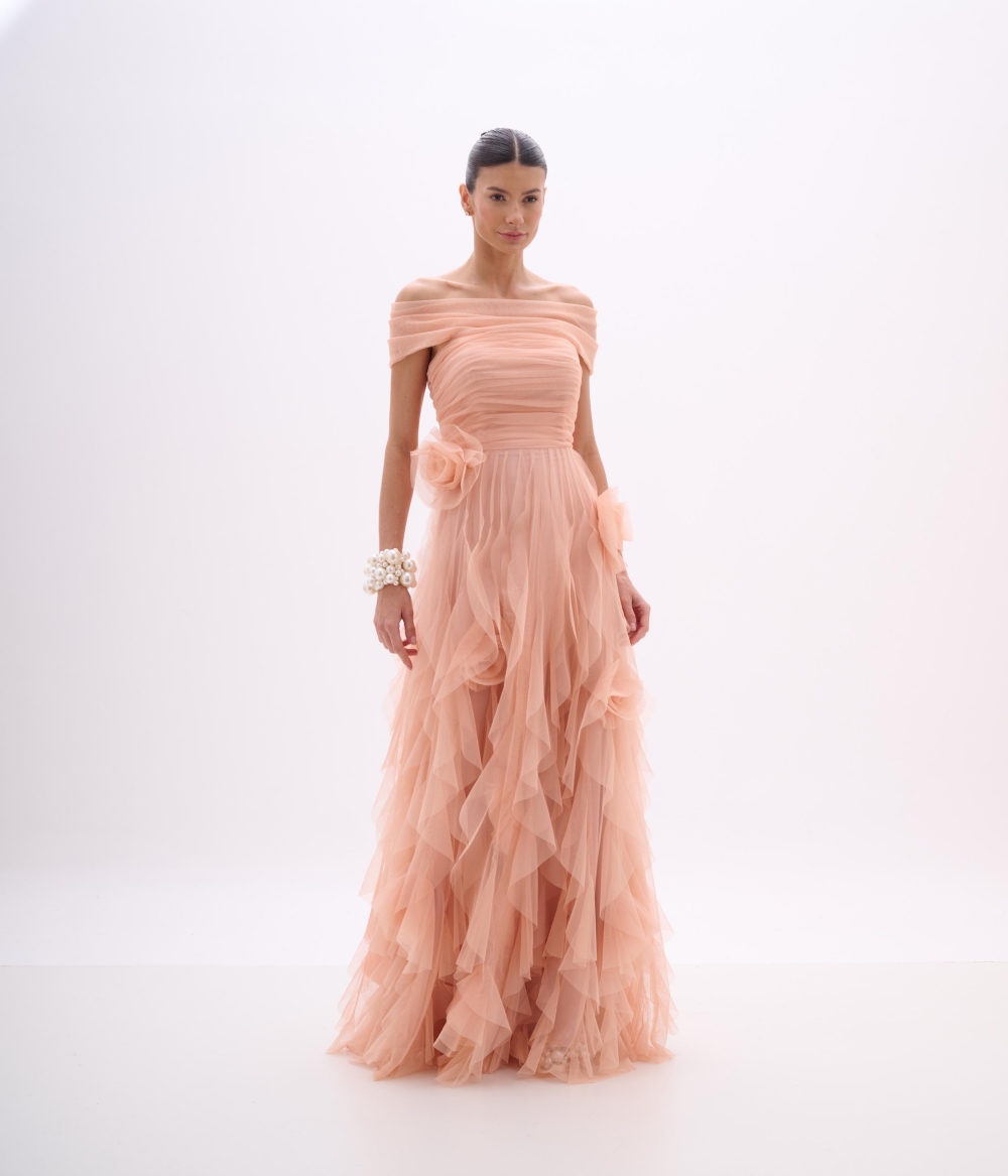 O vestido longo confeccionado em tule traz romantismo e movimento em uma proposta etérea e sofisticada. O decote ombro a ombro cria um visual delicado e feminino, enquanto o corpo drapeado valoriza o colo e a cintura. A saia em múltiplas camadas de tule adiciona fluidez, leveza e volume suave, criando um efeito esvoaçante marcante. As flores aplicadas na cintura complementam o design com um toque artesanal e poético.
