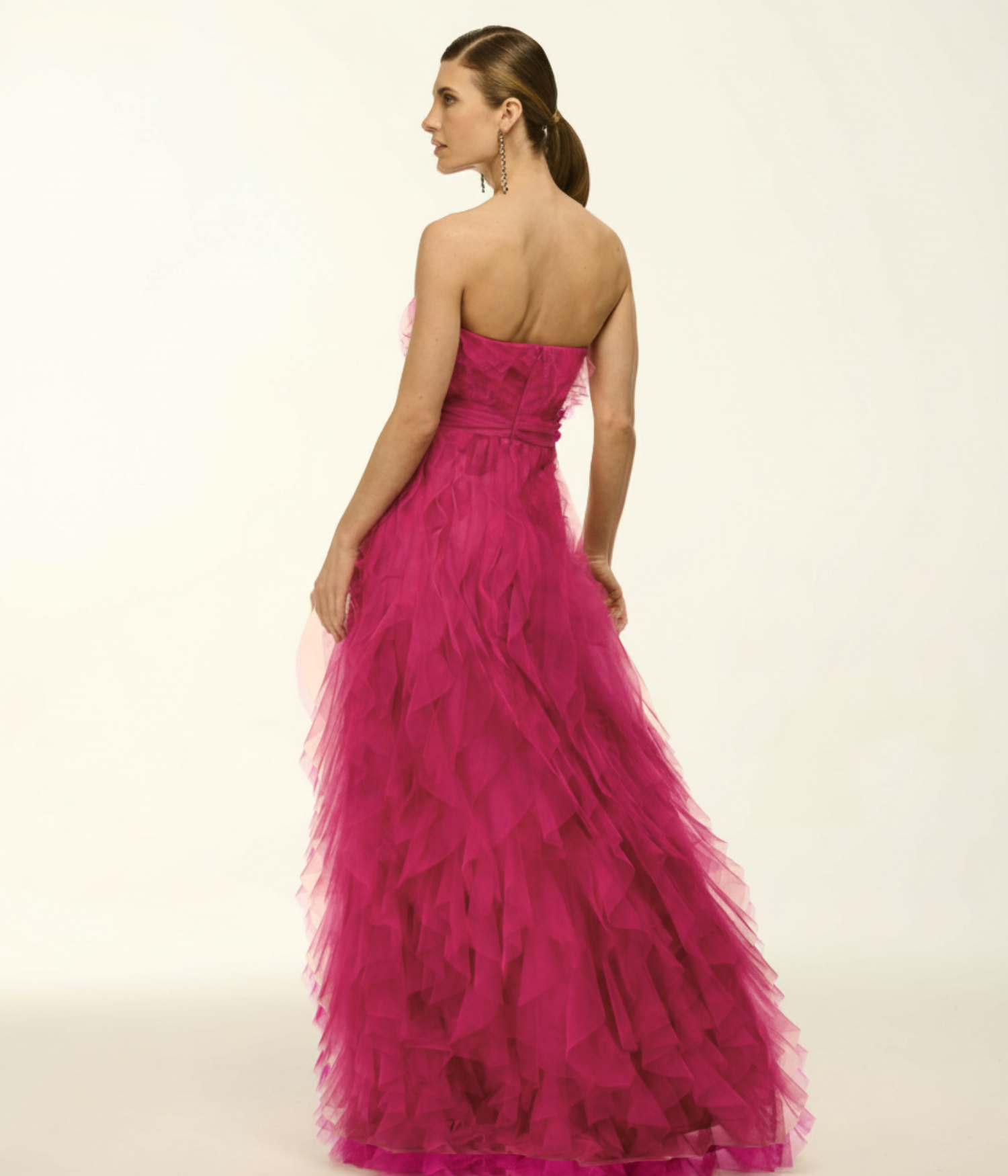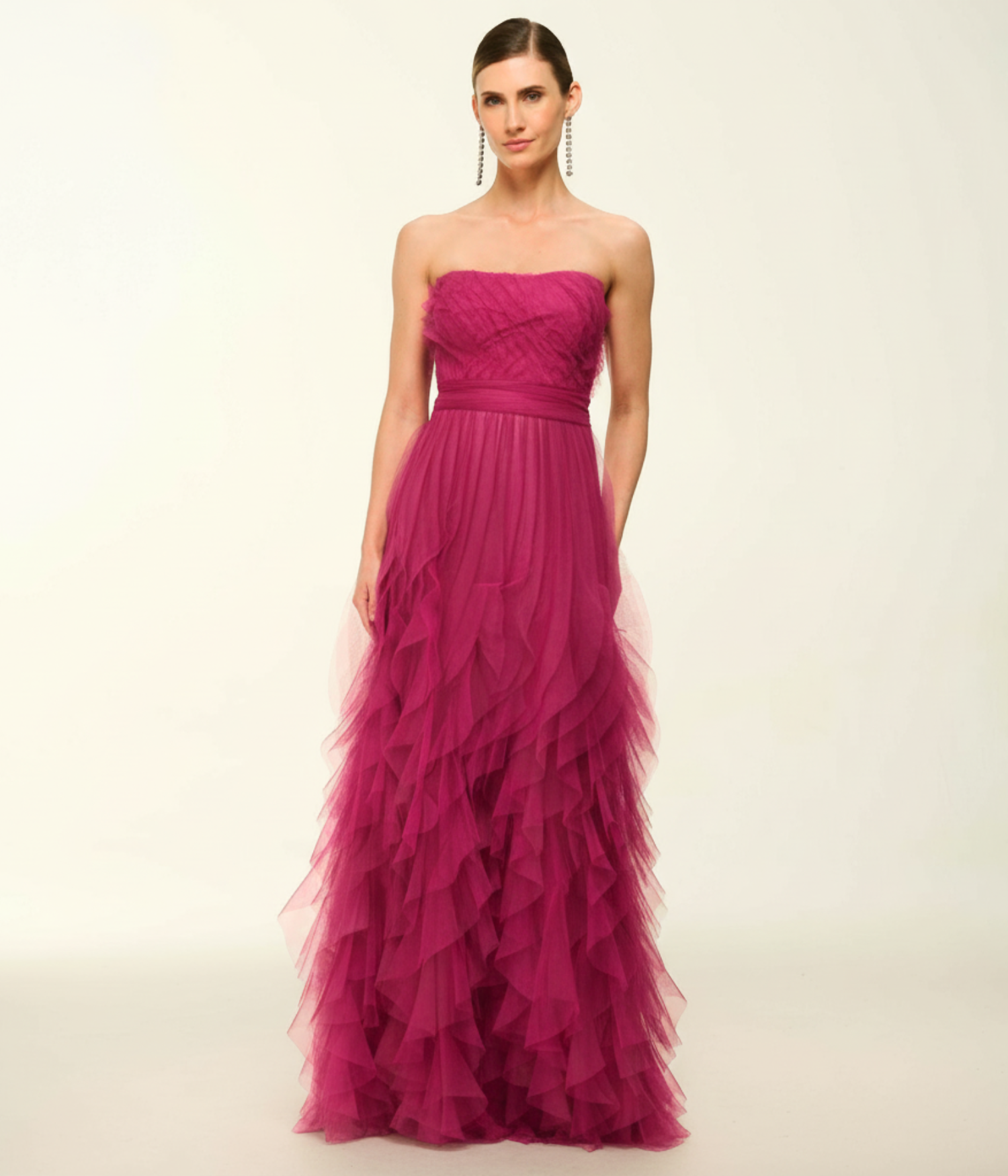 O tule é reverenciado na moda festa de alto padrão por sua capacidade única de criar volumes dramáticos com uma transparência etérea. Neste modelo, o tecido foi trabalhado com extrema perícia em camadas sobrepostas, o que confere um aspecto visualmente flutuante e uma textura tátil riquíssima. Além de sua nobreza estética, o tule permite um caimento fluido que não marca o corpo, mantendo o frescor e a sofisticação da peça durante todo o evento.