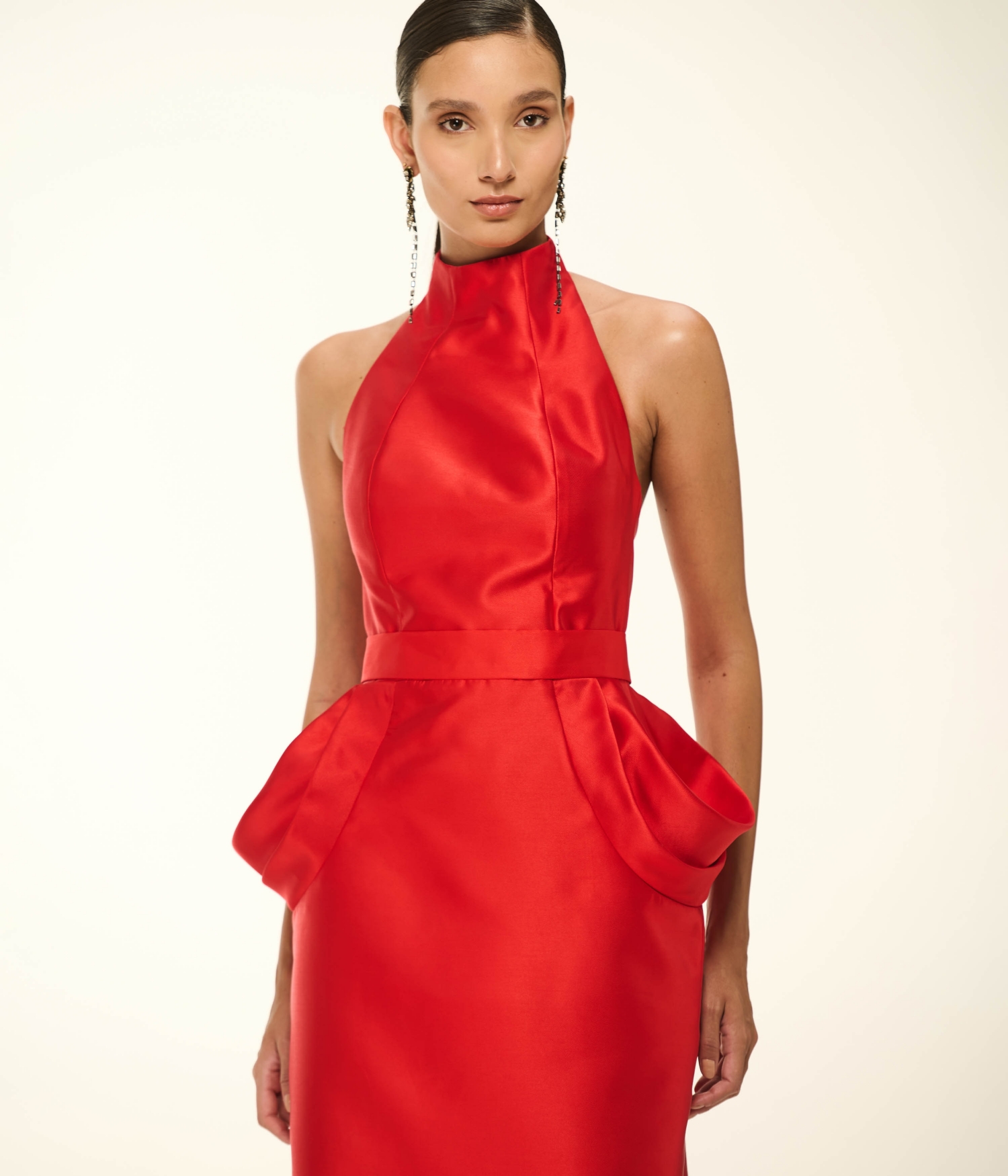 - Detalhes: Decote halter gola alta, pala dupla estilo peplum estruturada, cintura marcada, saia reta longa
