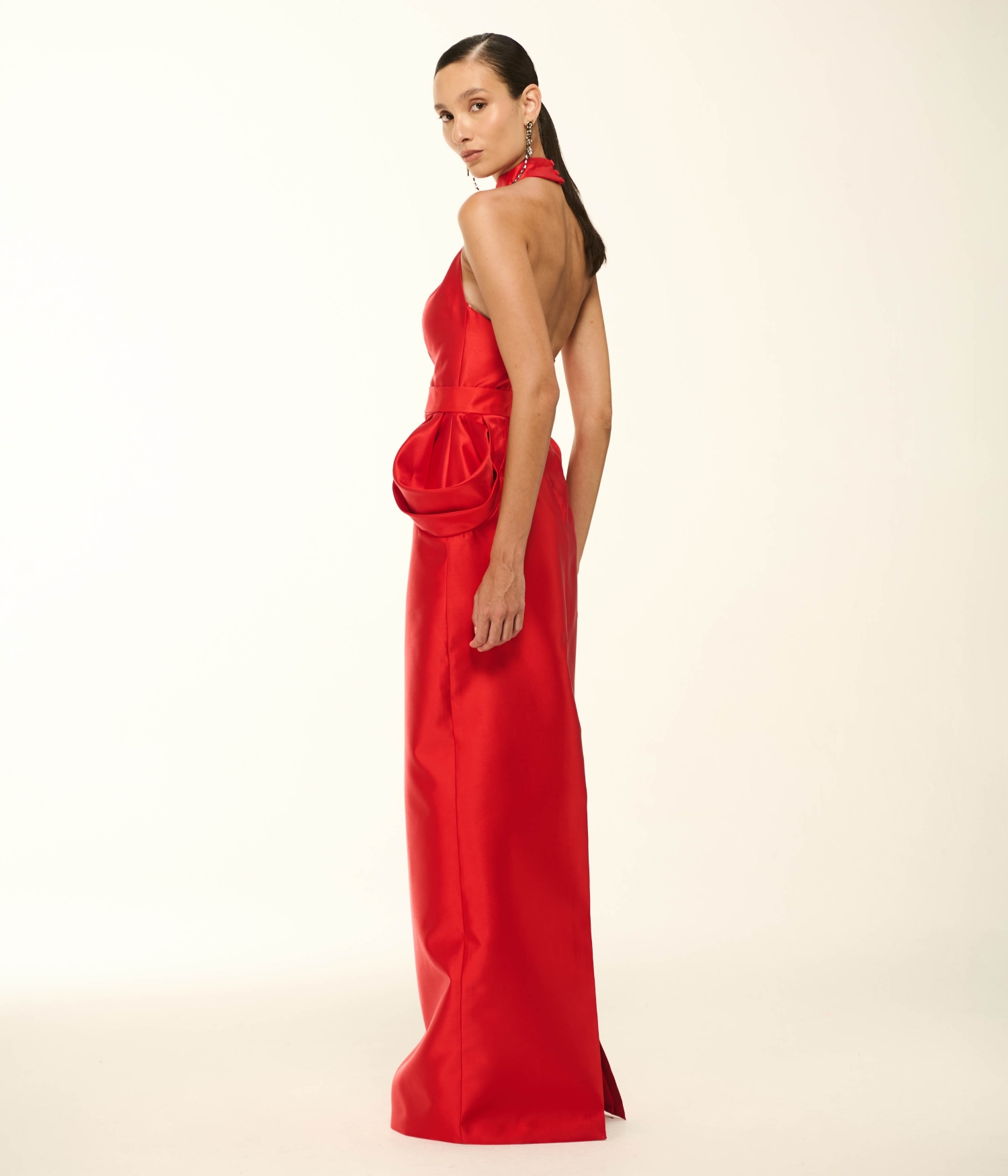 Vestido Longo em Zibeline com Decote Halter e Pala Escultural