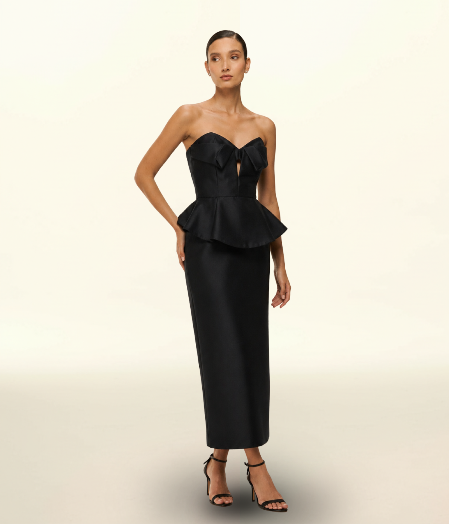 VESTIDO LONGO EM ZIBELINE COM PEPLUM ESTRUTURADO E DECOTE CORAÇÃO