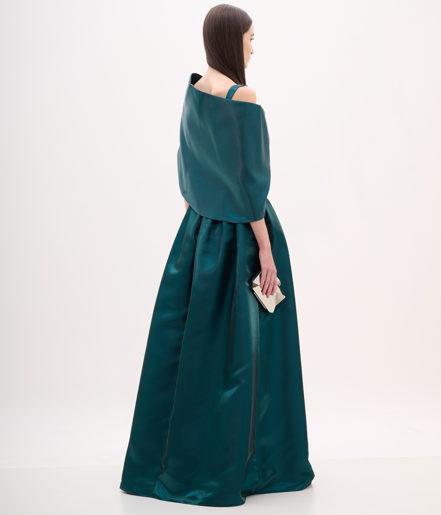 O Vestido Longo VL9944 é uma peça de presença cênica, desenhada para mulheres que buscam sofisticação máxima. Confeccionado no nobre Zibeline Liquid, o tecido se diferencia pelo seu brilho intenso e acetinado, com um caimento que lembra metal líquido, escorrendo pelo corpo com peso e elegância. O destaque absoluto do design é a Pelerine (Capa) integrada: uma extensão do tecido que cobre os ombros e braços de forma fluida, criando uma capa dorsal que garante movimento dramático e um porte de realeza. A base do vestido mantém uma silhueta coluna/ajustada, equilibrando o volume da capa com a linha longilínea do corpo.