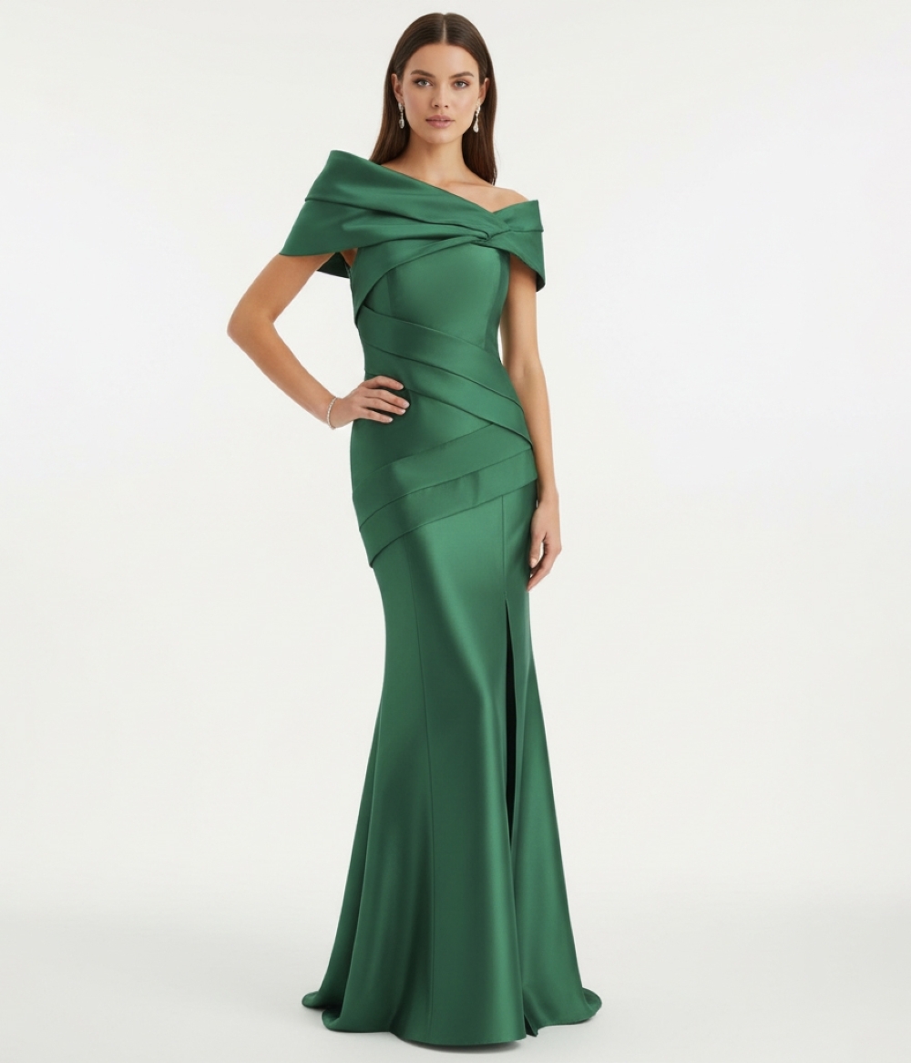O Vestido Longo em Zibeline Verde Esmeralda é a expressão máxima de glamour e sofisticação. Confeccionado em zibeline, tecido nobre e estruturado, o modelo esculpe a silhueta com uma modelagem sereia que valoriza as curvas de forma elegante. O destaque absoluto é o decote ombro a ombro com detalhe de dobra (lapela) estruturada, que emoldura o colo e os ombros com imponência. O corpo possui um trabalho refinado de drapeados diagonais que afinam a cintura, enquanto a saia se abre com fluidez na barra, complementada por uma fenda lateral profunda que traz sensualidade e movimento. A cor verde esmeralda, vibrante e luxuosa, torna a peça inesquecível.