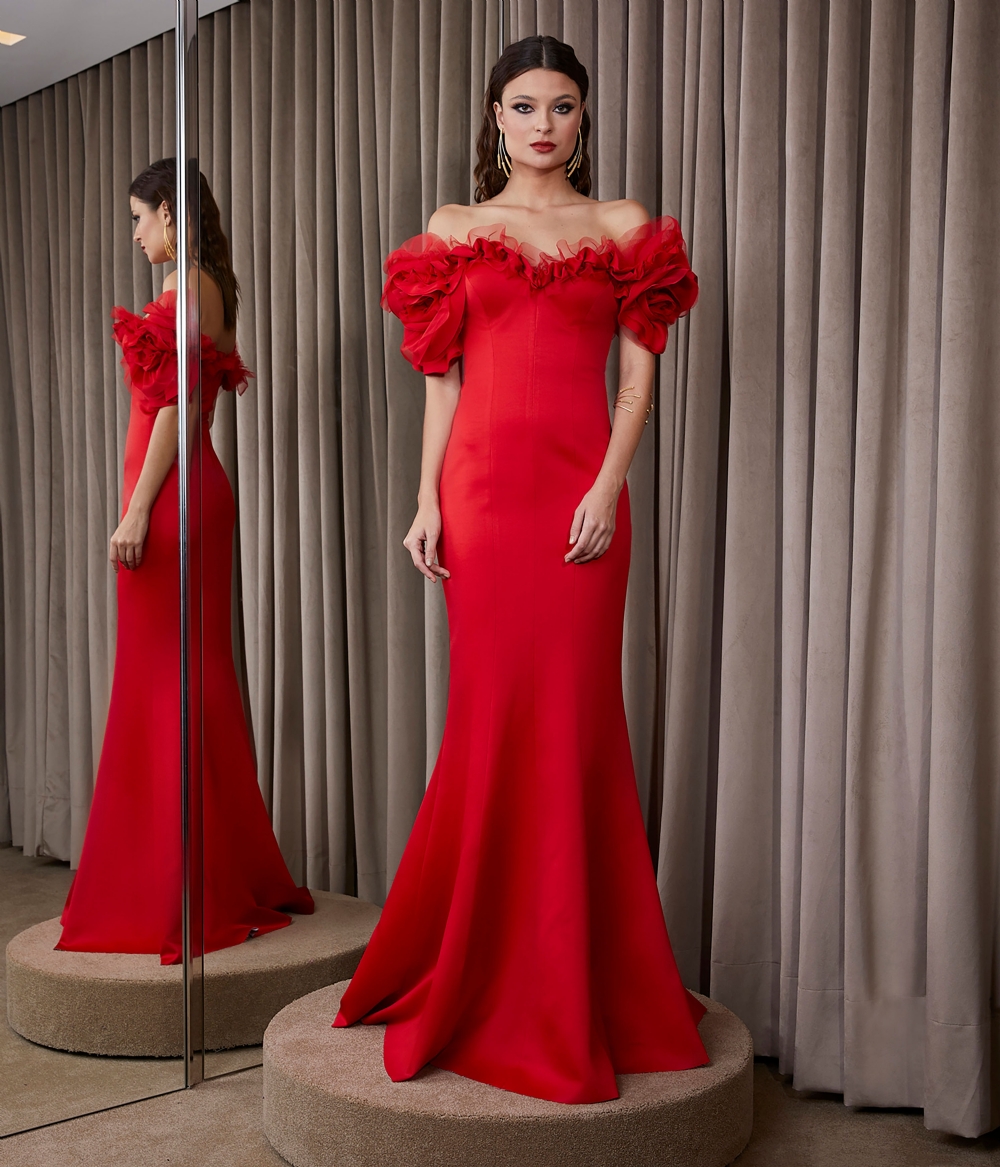O vestido longo ombro a ombro é uma peça marcante e sofisticada, que combina estrutura impecável com delicadeza artesanal. A silhueta ajustada valoriza as curvas com elegância, enquanto o detalhe de flores em tule no decote transforma o look em um verdadeiro destaque.