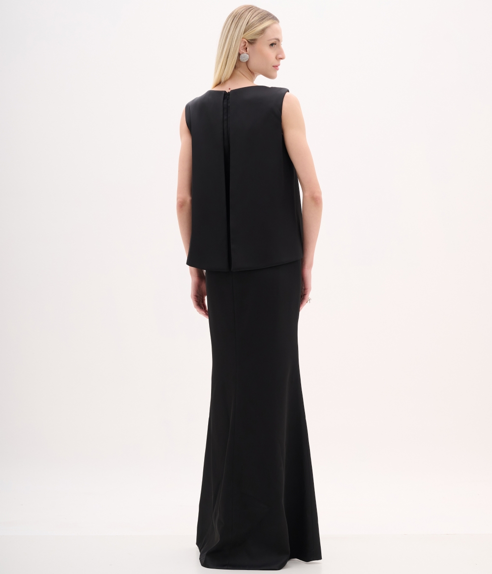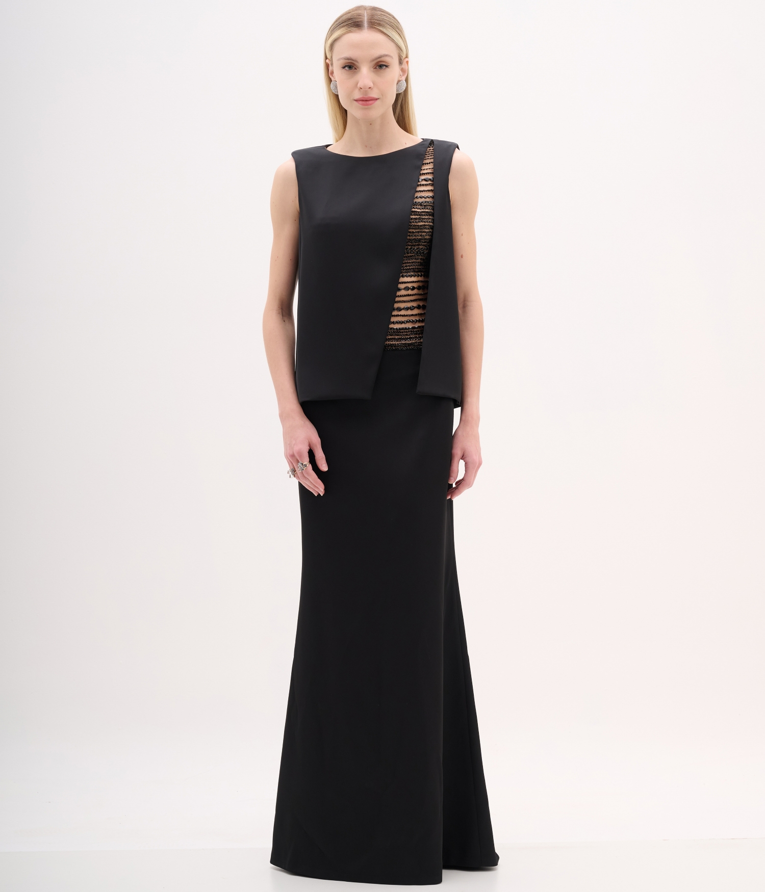 Vestido Longo Preto em Crepe com Sobreposição de Tule Bordado