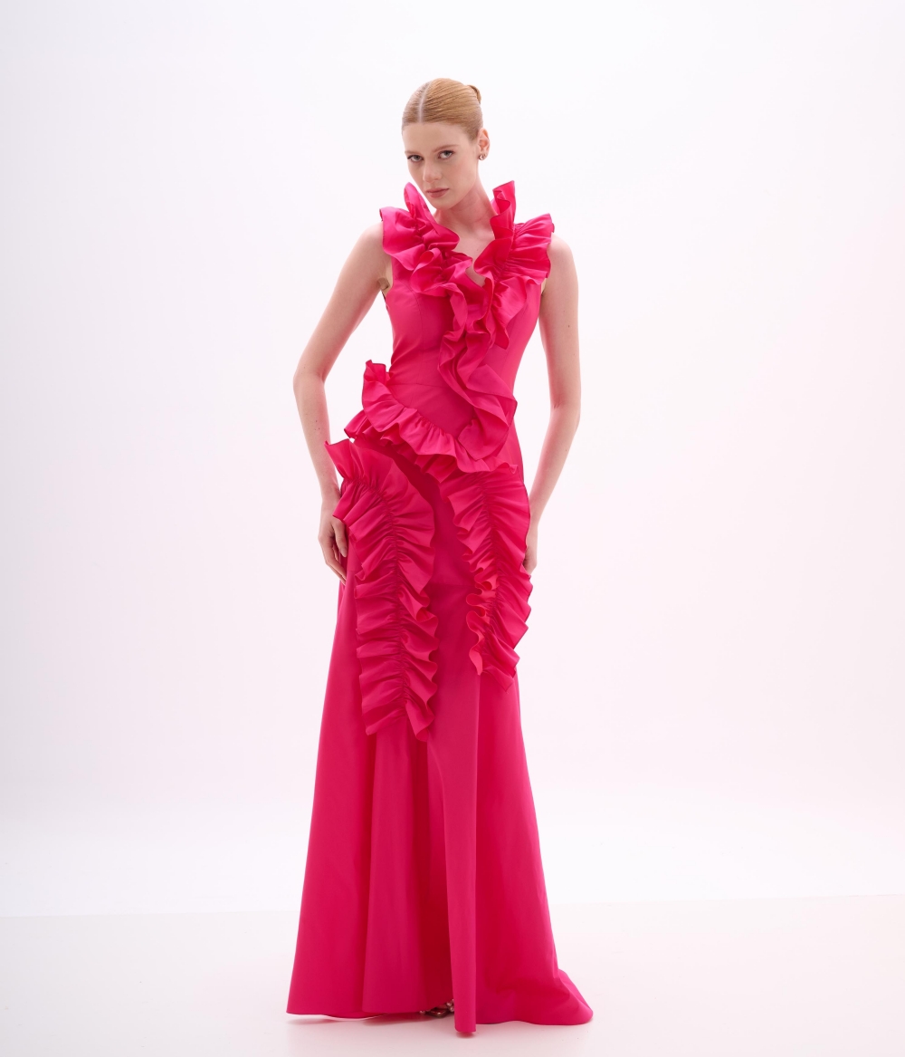 Vestido Longo Sereia em Tafetá Pink com Babados Esculturais