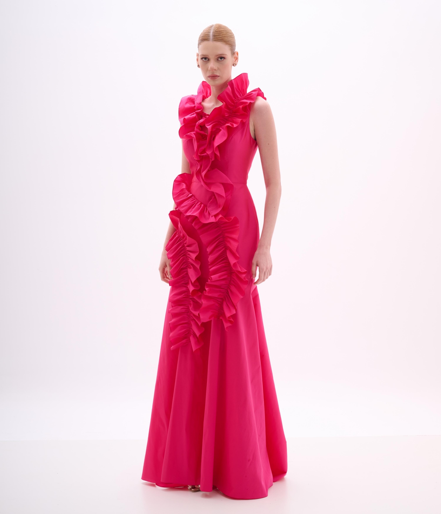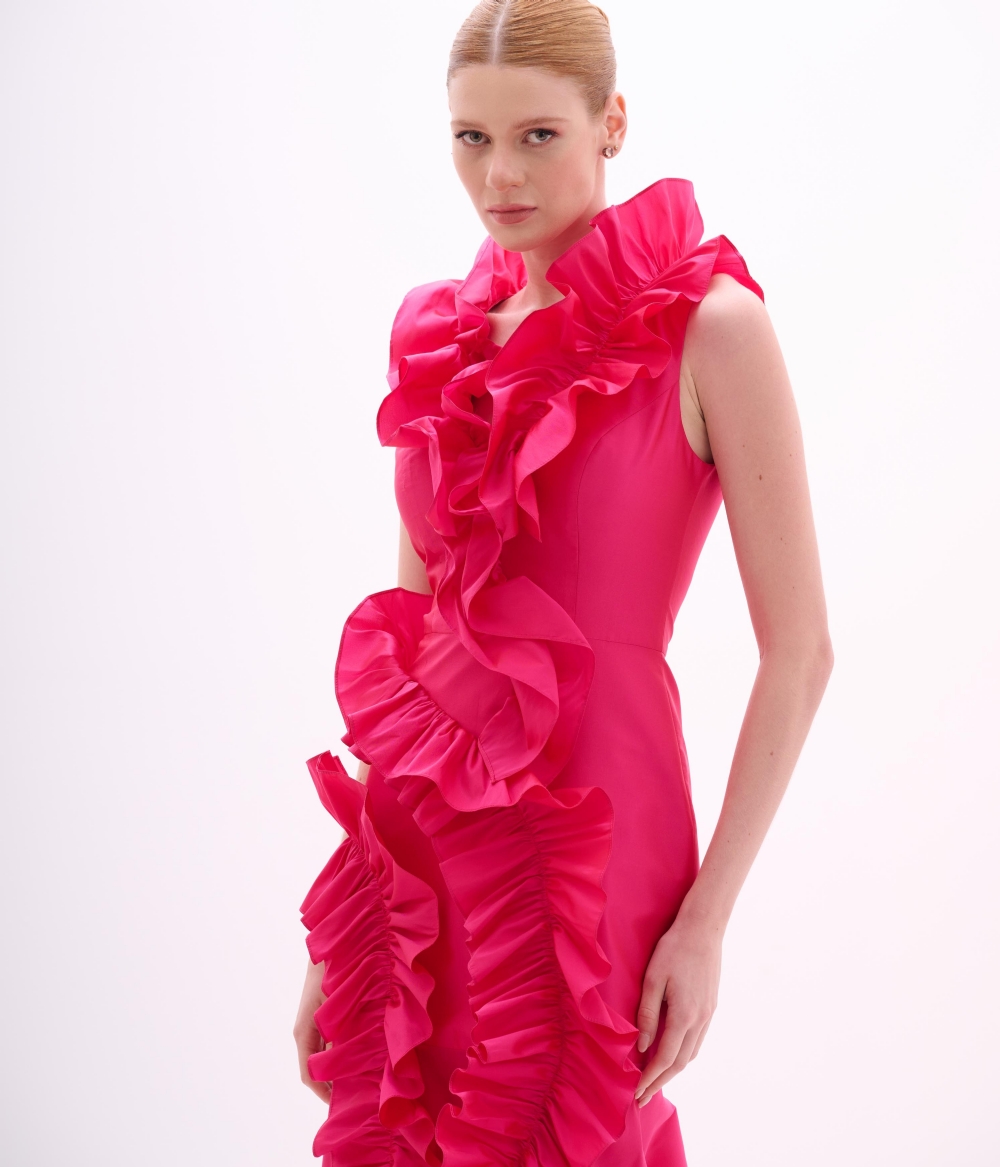 O Vestido Longo VE046 é uma verdadeira obra arquitetônica. Confeccionado em tafetá pink vibrante, o modelo explora o volume e a estrutura do tecido para criar uma silhueta inesquecível. Sua modelagem sereia desenha o corpo com precisão: ajusta-se perfeitamente ao busto, cintura e quadril, abrindo-se dramaticamente a partir dos joelhos para criar movimento e imponência na barra. O destaque absoluto são os babados orgânicos e esculturais que adornam o decote alto e descem em cascata pela lateral da saia. Esses volumes não são apenas decorativos, mas construídos para moldar e alongar a silhueta, trazendo um ar de alta costura contemporânea.