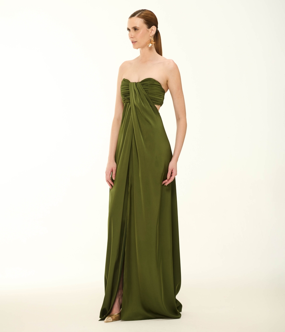 Vestido Longo em Cetim com Tomara que Caia e Drapeado na Parte Superior