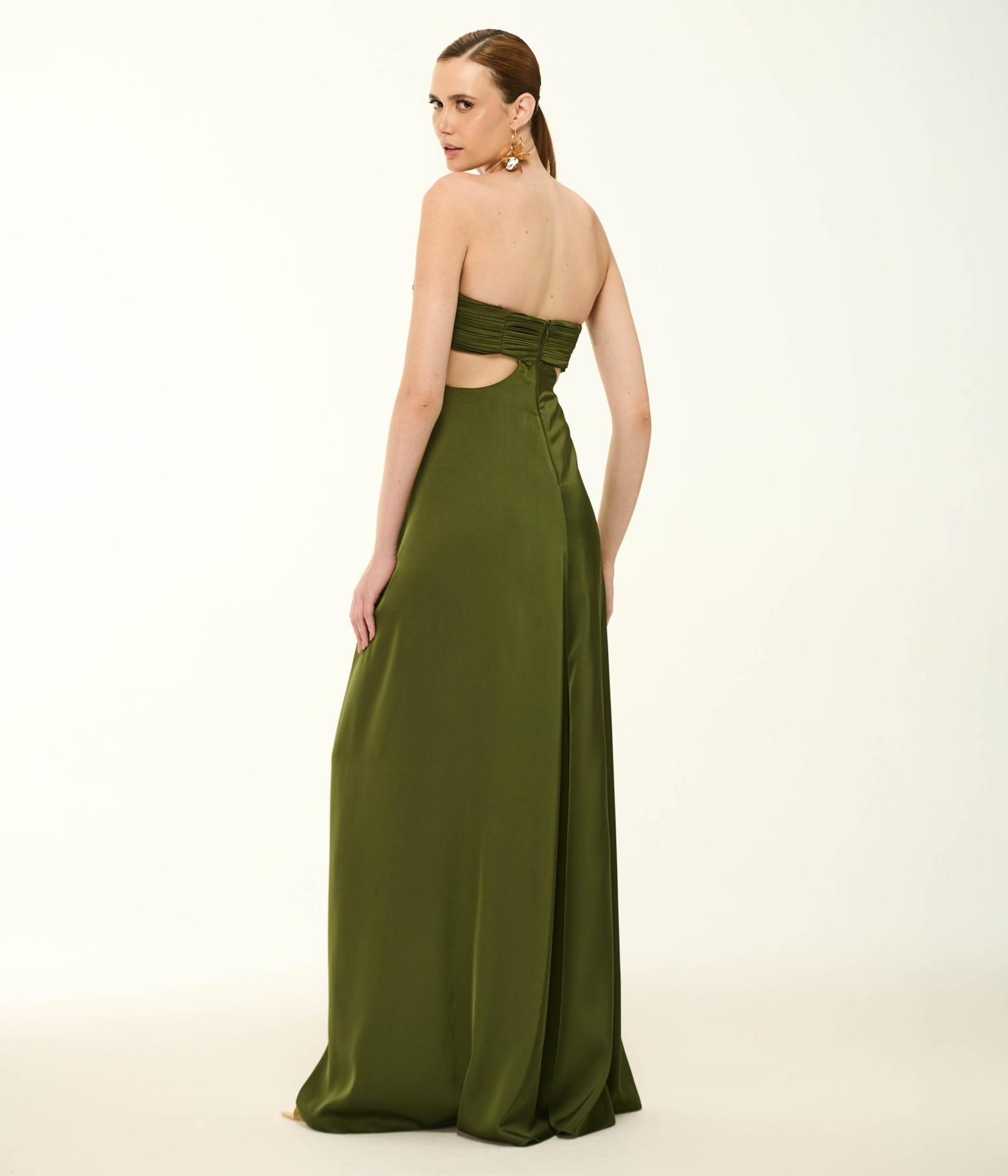 O VL354 é um vestido longo que traduz elegância com uma leitura sofisticada e contemporânea. Confeccionado em cetim, o modelo apresenta modelagem tomara que caia, com busto estruturado e drapeado concentrado na parte superior, criando um desenho marcante que valoriza o colo com delicadeza e presença. A cintura é levemente ajustada, conduzindo para uma saia longa de caimento fluido, com volume suave e movimento elegante. O efeito visual da peça é refinado e impactante, com acabamento impecável e uma silhueta que alonga o corpo com naturalidade. Na cor moss, o vestido ganha ainda mais profundidade e sofisticação, reforçando sua proposta de luxo discreto e atemporal.