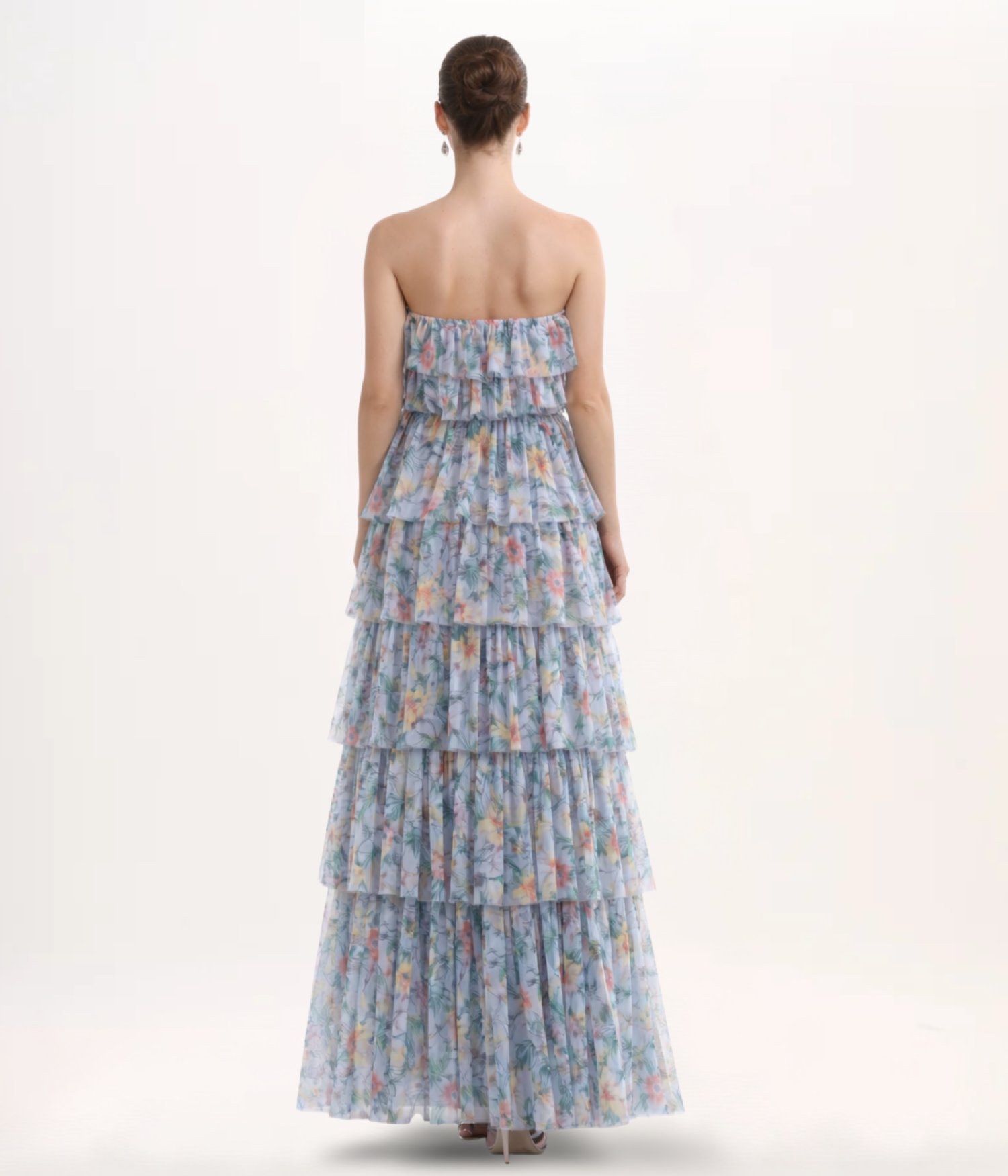O Vestido Longo VE100 é a personificação da leveza etérea e do glamour romântico. Confeccionado em Tule fluido, o modelo ganha vida através de uma exclusiva estampa floral em tons pastel (rosa, coral e amarelo) aplicada sobre um sofisticado fundo azul pálido. O design superior é marcado por um elegante decote Tomara que Caia, que valoriza o colo e os ombros, equilibrando o volume da peça. O grande espetáculo visual, no entanto, está na sua arquitetura inferior: uma majestosa saia construída em múltiplas camadas de babados horizontais (tiered ruffles). Cada camada de tule franzido adiciona textura e um movimento esvoaçante, conferindo um porte de realeza contemporânea e um caimento de "nuvem" a cada passo.