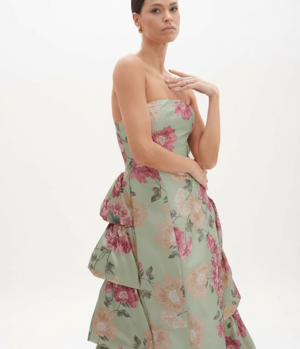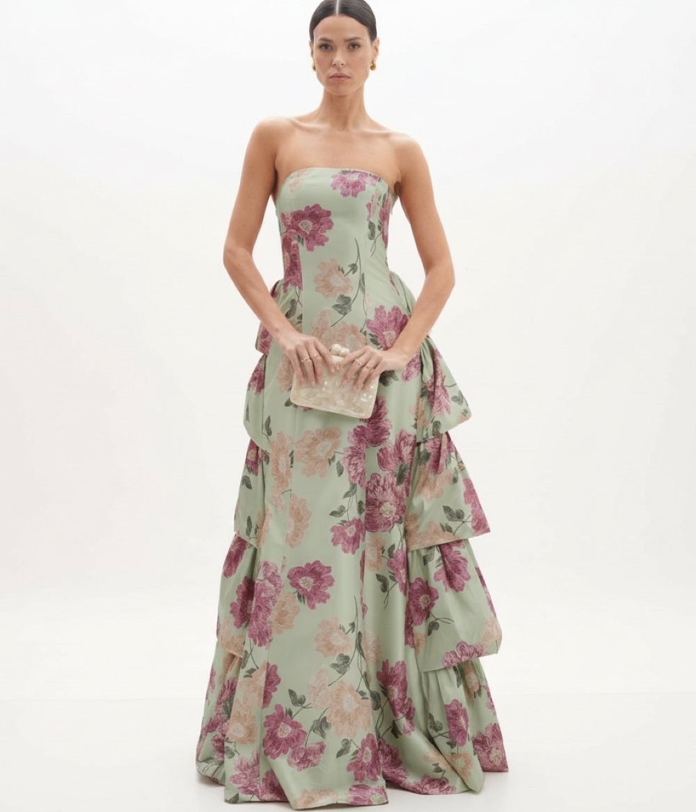 O Vestido Longo VL9855 é uma peça de impacto 360º, desenhada para impressionar de todos os ângulos. Sua modelagem tomara que caia apresenta um corpete estruturado que valoriza o colo e os ombros com uma elegância escultural. A Estampa Exclusiva ganha vida sobre o tafetá, transformando o vestido em uma obra de arte vibrante. O grande diferencial, porém, revela-se no movimento: a parte posterior da saia é adornada com uma construção de babados volumosos em cascata. Esse detalhe arquitetônico cria um efeito dramático nas costas, conferindo opulência e um caimento inesquecível ao caminhar.