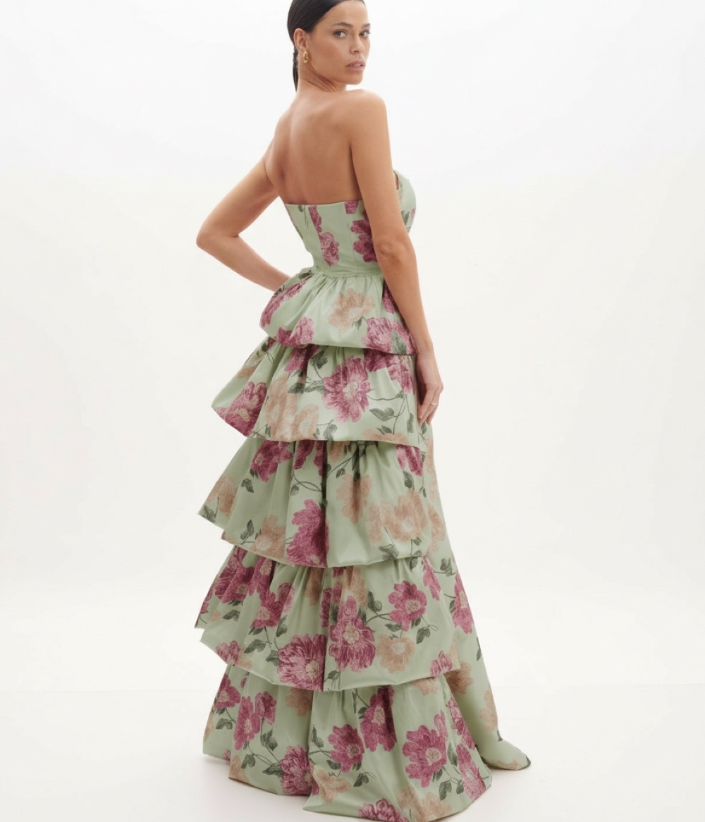 VESTIDO LONGO TOMARA QUE CAIA ESTAMPADO COM CASCATA POSTERIOR