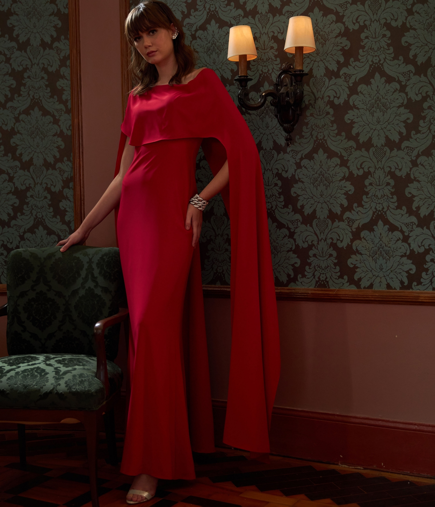 Vestido longo vermelho com capa sobreposta