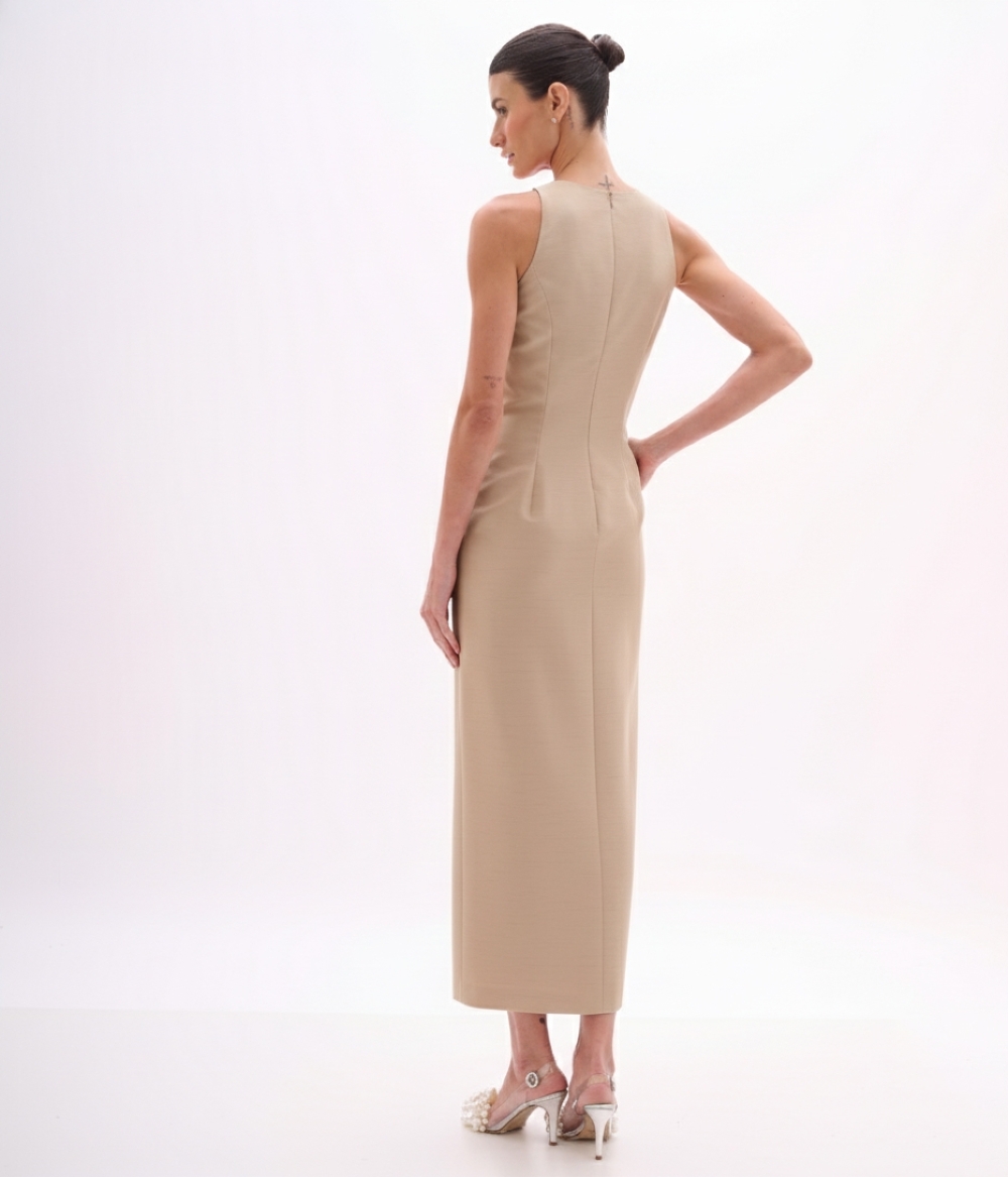 Vestido midi confeccionado em shantung encorpado, tecido clássico com leve brilho acetinado e textura sutil que garante estrutura e sofisticação ao look. Seu design alongado valoriza a silhueta com elegância, trazendo lapela alfaiatada e fechamento frontal por botões forrados, que criam uma linha vertical contínua e extremamente refinada.