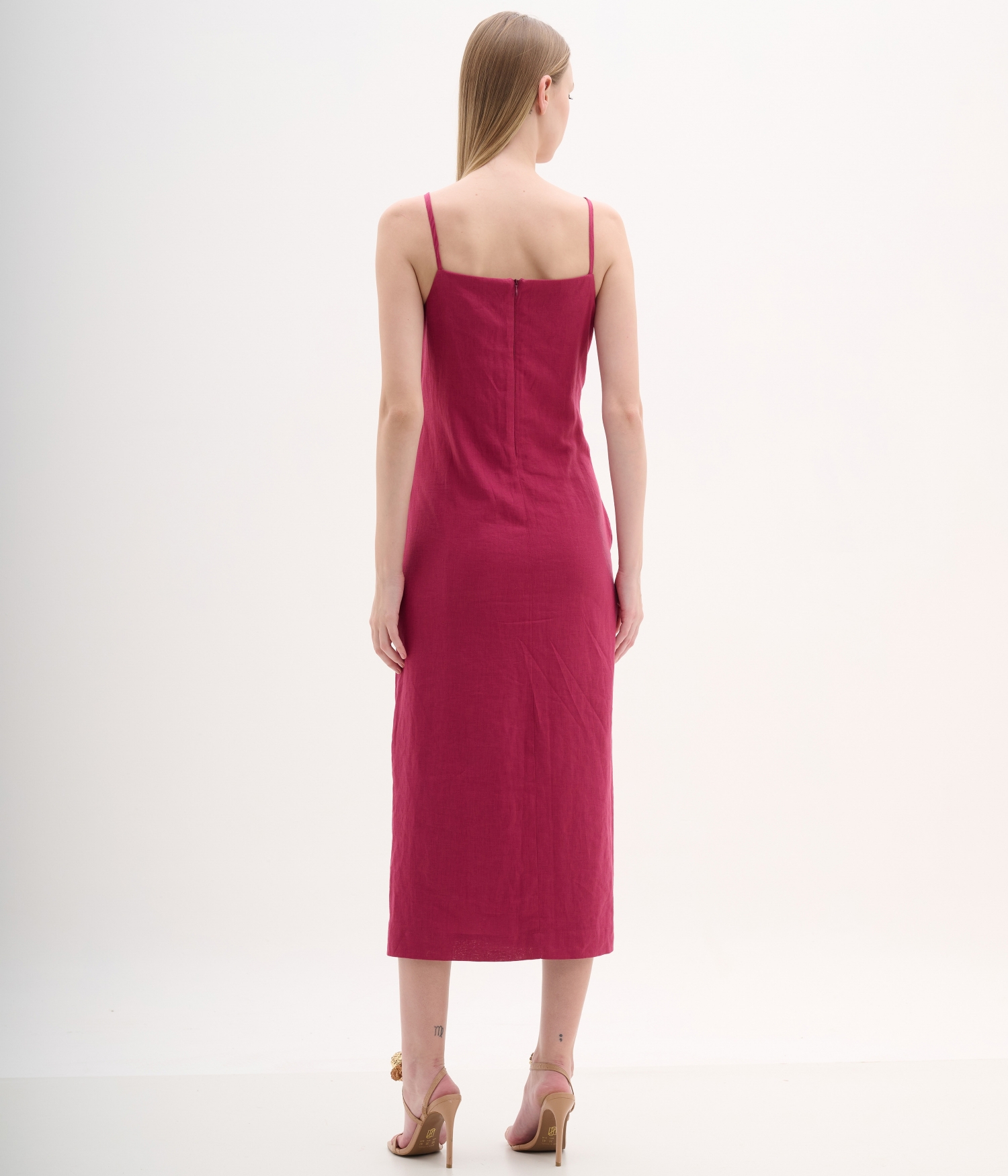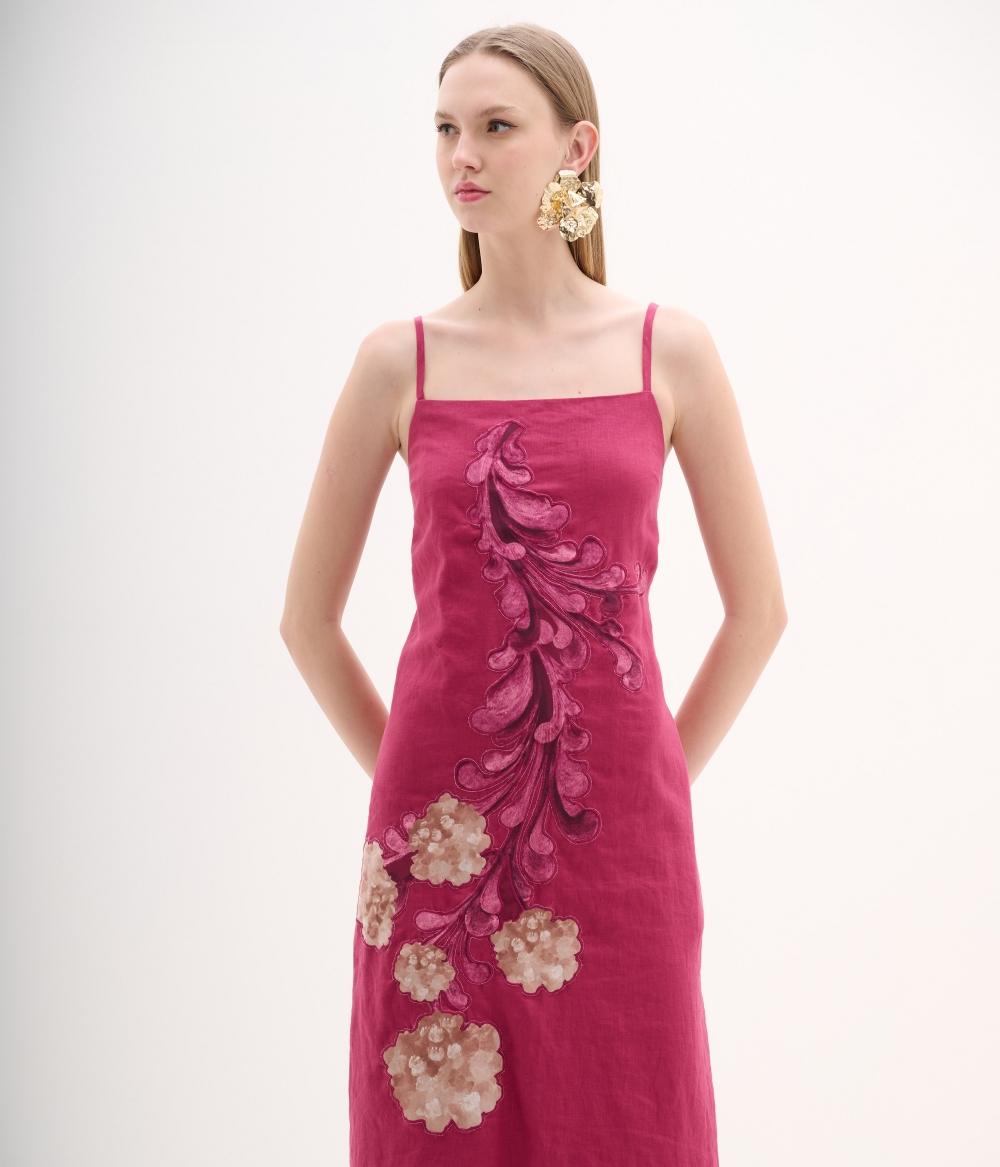 Vestido midi em viscolinho rosa queimado com alças finas e bordado floral