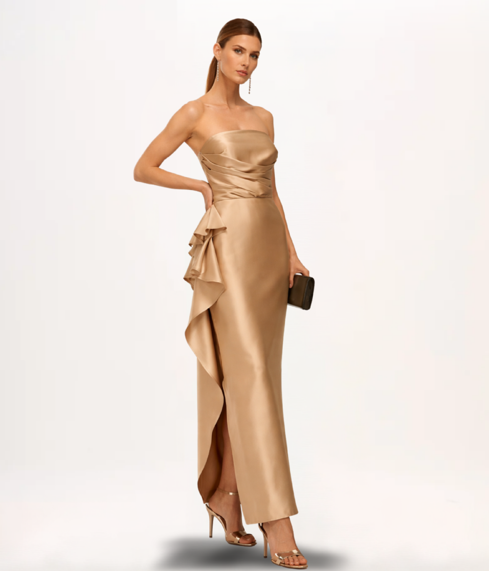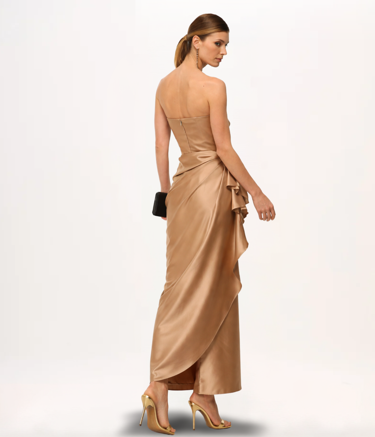 O Vestido VL10081 é a expressão sublime da elegância arquitetônica e do glamour noturno. Confeccionado em cetim de brilho luxuoso e caimento suntuoso, o modelo destaca-se por um impecável decote tomara que caia em formato coração, enriquecido por drapeados minuciosos no corpete que modelam e valorizam a silhueta. O grande espetáculo visual da peça é a dramática cascata de babados esculturais que nasce na linha da cintura e desce lateralmente, criando um movimento fluido e poético. A saia de comprimento midi, de corte reto e refinado, conta com uma fenda sutil que garante mobilidade e um toque extra de sofisticação. É a escolha definitiva para mulheres que desejam unir o clássico ao contemporâneo com máxima nobreza e presença impecável.