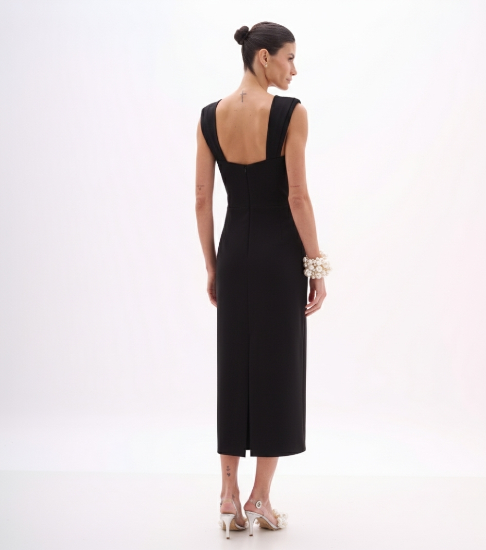 Vestido midi confeccionado em crepe de malha, tecido encorpado e confortável que modela o corpo com elegância sem perder a leveza. O design traz um toque contemporâneo, com construção impecável que valoriza a silhueta de forma sutil e refinada.