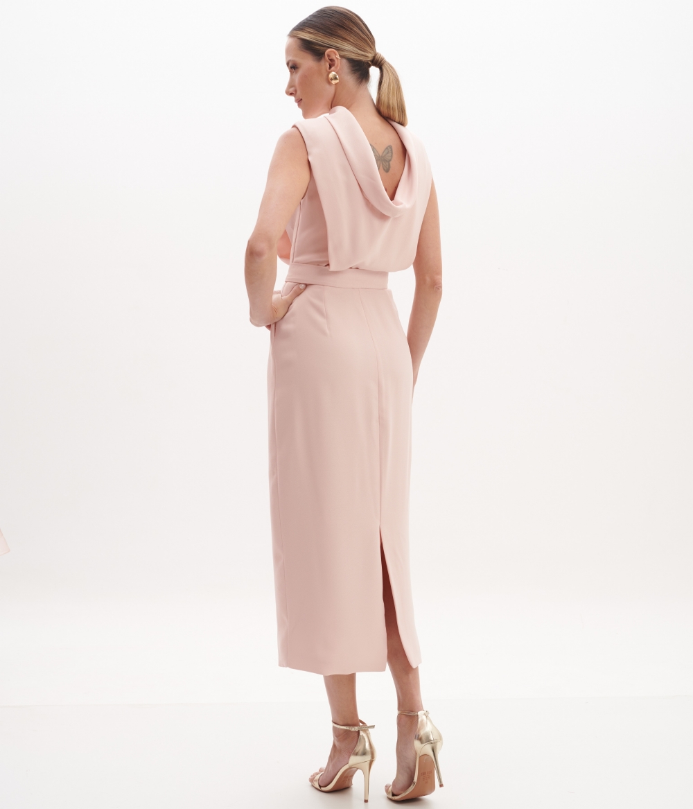 Decote drapeado nas costas, fluido e feminino, com caimento impecável.
